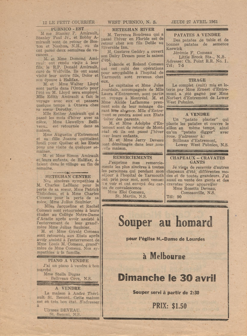 Le Courrier is Nova Scotia's leading French-language newspaper, and the only one with province-wide coverage and distribution. First published by Désiré d'Éon as Le Petit Courrier (Du Sud-Ouest de la Nouvelle-Écosse) on 10 February 1937, it has appeared weekly ever since, informing its readers, defending the interests of Acadians and francophones, and providing a bridge linking all Acadian regions in the province. It offers community news and events, extended articles, advertisements, announcements, photographs and special supplements, all directed towards supporting Nova Scotia's large, dispersed and diversified Acadian population, its businesses, industries, economy, daily activities, schools and higher education, politics, cultural life and heritage. Le Courrier offers an outstanding and unparalleled perspective on 66 years' accumulated history of Nova Scotia's Acadian population, thus enabling exploration of interests, activities, accomplishments, concerns and community issues across a broad swath of the 20th century.