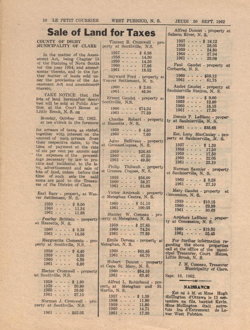 Le Courrier is Nova Scotia's leading French-language newspaper, and the only one with province-wide coverage and distribution. First published by Désiré d'Éon as Le Petit Courrier (Du Sud-Ouest de la Nouvelle-Écosse) on 10 February 1937, it has appeared weekly ever since, informing its readers, defending the interests of Acadians and francophones, and providing a bridge linking all Acadian regions in the province. It offers community news and events, extended articles, advertisements, announcements, photographs and special supplements, all directed towards supporting Nova Scotia's large, dispersed and diversified Acadian population, its businesses, industries, economy, daily activities, schools and higher education, politics, cultural life and heritage. Le Courrier offers an outstanding and unparalleled perspective on 66 years' accumulated history of Nova Scotia's Acadian population, thus enabling exploration of interests, activities, accomplishments, concerns and community issues across a broad swath of the 20th century.