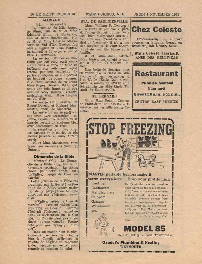 Le Courrier is Nova Scotia's leading French-language newspaper, and the only one with province-wide coverage and distribution. First published by Désiré d'Éon as Le Petit Courrier (Du Sud-Ouest de la Nouvelle-Écosse) on 10 February 1937, it has appeared weekly ever since, informing its readers, defending the interests of Acadians and francophones, and providing a bridge linking all Acadian regions in the province. It offers community news and events, extended articles, advertisements, announcements, photographs and special supplements, all directed towards supporting Nova Scotia's large, dispersed and diversified Acadian population, its businesses, industries, economy, daily activities, schools and higher education, politics, cultural life and heritage. Le Courrier offers an outstanding and unparalleled perspective on 66 years' accumulated history of Nova Scotia's Acadian population, thus enabling exploration of interests, activities, accomplishments, concerns and community issues across a broad swath of the 20th century.