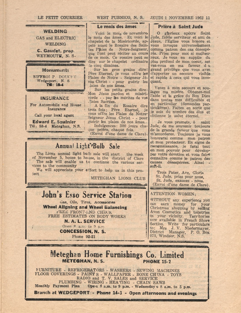 Le Courrier is Nova Scotia's leading French-language newspaper, and the only one with province-wide coverage and distribution. First published by Désiré d'Éon as Le Petit Courrier (Du Sud-Ouest de la Nouvelle-Écosse) on 10 February 1937, it has appeared weekly ever since, informing its readers, defending the interests of Acadians and francophones, and providing a bridge linking all Acadian regions in the province. It offers community news and events, extended articles, advertisements, announcements, photographs and special supplements, all directed towards supporting Nova Scotia's large, dispersed and diversified Acadian population, its businesses, industries, economy, daily activities, schools and higher education, politics, cultural life and heritage. Le Courrier offers an outstanding and unparalleled perspective on 66 years' accumulated history of Nova Scotia's Acadian population, thus enabling exploration of interests, activities, accomplishments, concerns and community issues across a broad swath of the 20th century.