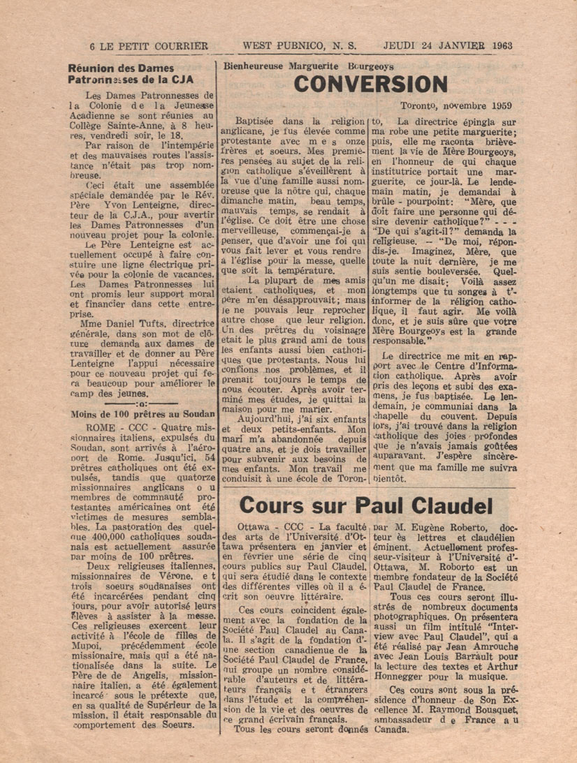 Le Courrier is Nova Scotia's leading French-language newspaper, and the only one with province-wide coverage and distribution. First published by Désiré d'Éon as Le Petit Courrier (Du Sud-Ouest de la Nouvelle-Écosse) on 10 February 1937, it has appeared weekly ever since, informing its readers, defending the interests of Acadians and francophones, and providing a bridge linking all Acadian regions in the province. It offers community news and events, extended articles, advertisements, announcements, photographs and special supplements, all directed towards supporting Nova Scotia's large, dispersed and diversified Acadian population, its businesses, industries, economy, daily activities, schools and higher education, politics, cultural life and heritage. Le Courrier offers an outstanding and unparalleled perspective on 66 years' accumulated history of Nova Scotia's Acadian population, thus enabling exploration of interests, activities, accomplishments, concerns and community issues across a broad swath of the 20th century.