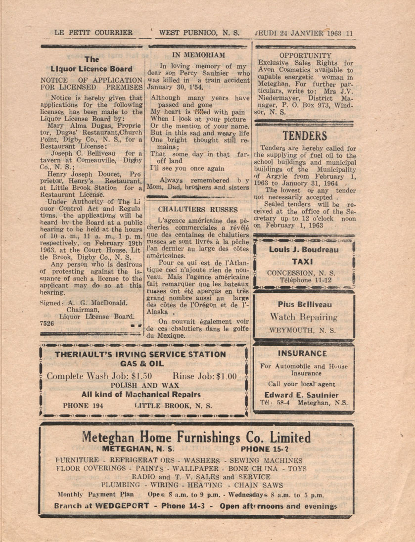 Le Courrier is Nova Scotia's leading French-language newspaper, and the only one with province-wide coverage and distribution. First published by Désiré d'Éon as Le Petit Courrier (Du Sud-Ouest de la Nouvelle-Écosse) on 10 February 1937, it has appeared weekly ever since, informing its readers, defending the interests of Acadians and francophones, and providing a bridge linking all Acadian regions in the province. It offers community news and events, extended articles, advertisements, announcements, photographs and special supplements, all directed towards supporting Nova Scotia's large, dispersed and diversified Acadian population, its businesses, industries, economy, daily activities, schools and higher education, politics, cultural life and heritage. Le Courrier offers an outstanding and unparalleled perspective on 66 years' accumulated history of Nova Scotia's Acadian population, thus enabling exploration of interests, activities, accomplishments, concerns and community issues across a broad swath of the 20th century.