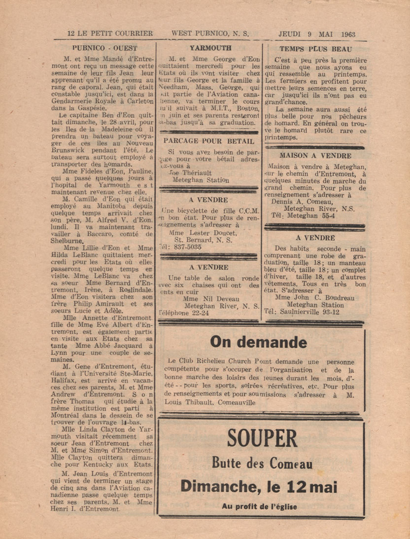 Le Courrier is Nova Scotia's leading French-language newspaper, and the only one with province-wide coverage and distribution. First published by Désiré d'Éon as Le Petit Courrier (Du Sud-Ouest de la Nouvelle-Écosse) on 10 February 1937, it has appeared weekly ever since, informing its readers, defending the interests of Acadians and francophones, and providing a bridge linking all Acadian regions in the province. It offers community news and events, extended articles, advertisements, announcements, photographs and special supplements, all directed towards supporting Nova Scotia's large, dispersed and diversified Acadian population, its businesses, industries, economy, daily activities, schools and higher education, politics, cultural life and heritage. Le Courrier offers an outstanding and unparalleled perspective on 66 years' accumulated history of Nova Scotia's Acadian population, thus enabling exploration of interests, activities, accomplishments, concerns and community issues across a broad swath of the 20th century.