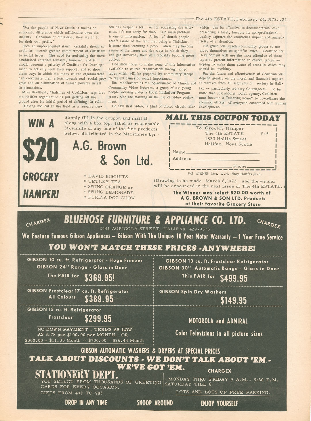 From its first issue on 17 April 1969, The 4th Estate established itself as the independent 'second viewpoint….[and] questioning voice in print in our city and province.' Near the end, in January 1977, publisher Brenda Large wrote, 'The 4th Estate really shouldn't exist at all. All the odds are against it and continue to be against it. But it has survived for eight years due to the work of Nick Fillmore and others who have contributed to the paper and have been loyal readers over the years.' Progressive, radical and provocative, The 4th Estate focused on the issues that mattered in late 20th century Nova Scotia — and which continue to matter to this day.