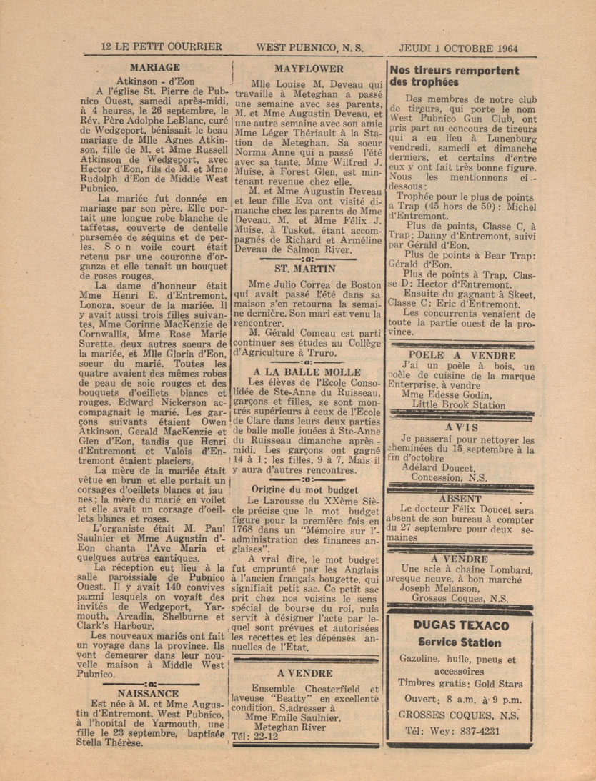 Le Courrier is Nova Scotia's leading French-language newspaper, and the only one with province-wide coverage and distribution. First published by Désiré d'Éon as Le Petit Courrier (Du Sud-Ouest de la Nouvelle-Écosse) on 10 February 1937, it has appeared weekly ever since, informing its readers, defending the interests of Acadians and francophones, and providing a bridge linking all Acadian regions in the province. It offers community news and events, extended articles, advertisements, announcements, photographs and special supplements, all directed towards supporting Nova Scotia's large, dispersed and diversified Acadian population, its businesses, industries, economy, daily activities, schools and higher education, politics, cultural life and heritage. Le Courrier offers an outstanding and unparalleled perspective on 66 years' accumulated history of Nova Scotia's Acadian population, thus enabling exploration of interests, activities, accomplishments, concerns and community issues across a broad swath of the 20th century.