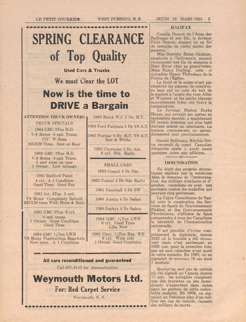 Le Courrier is Nova Scotia's leading French-language newspaper, and the only one with province-wide coverage and distribution. First published by Désiré d'Éon as Le Petit Courrier (Du Sud-Ouest de la Nouvelle-Écosse) on 10 February 1937, it has appeared weekly ever since, informing its readers, defending the interests of Acadians and francophones, and providing a bridge linking all Acadian regions in the province. It offers community news and events, extended articles, advertisements, announcements, photographs and special supplements, all directed towards supporting Nova Scotia's large, dispersed and diversified Acadian population, its businesses, industries, economy, daily activities, schools and higher education, politics, cultural life and heritage. Le Courrier offers an outstanding and unparalleled perspective on 66 years' accumulated history of Nova Scotia's Acadian population, thus enabling exploration of interests, activities, accomplishments, concerns and community issues across a broad swath of the 20th century.