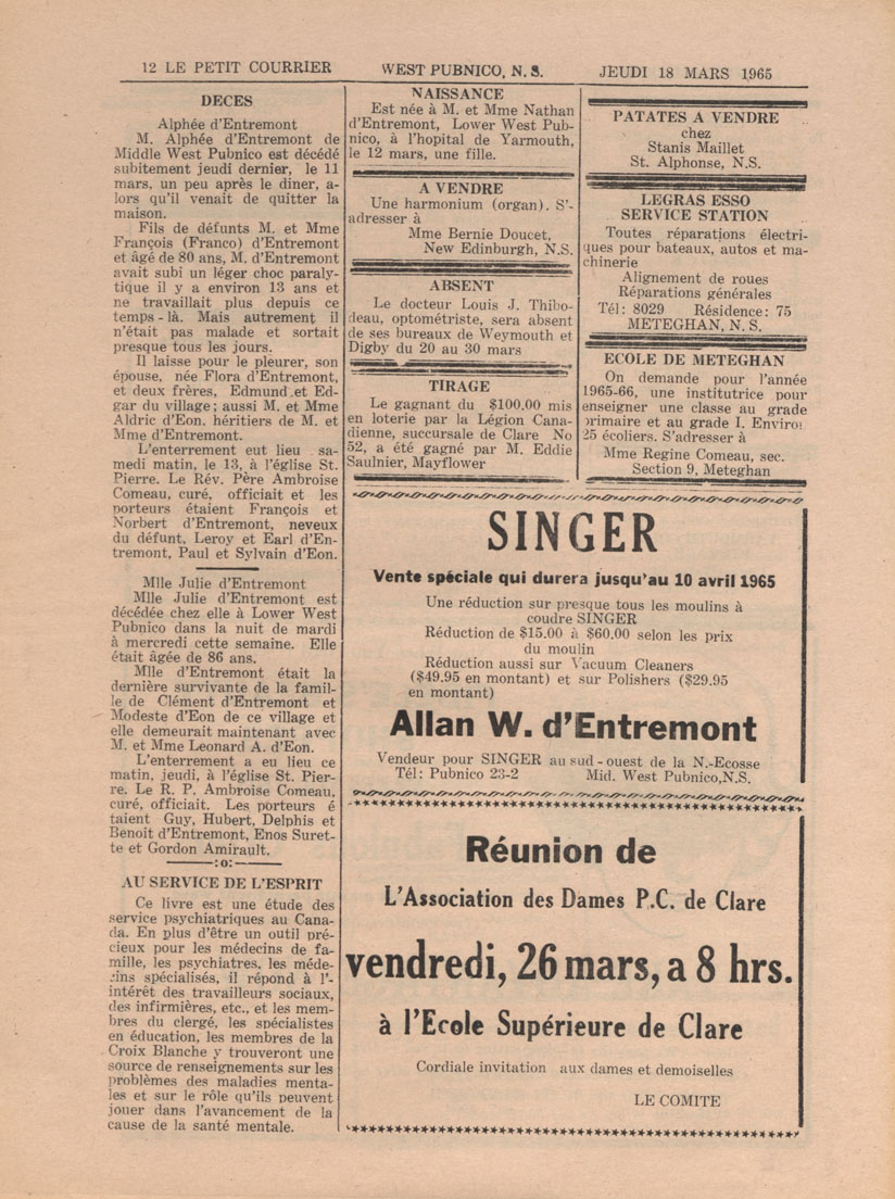 Le Courrier is Nova Scotia's leading French-language newspaper, and the only one with province-wide coverage and distribution. First published by Désiré d'Éon as Le Petit Courrier (Du Sud-Ouest de la Nouvelle-Écosse) on 10 February 1937, it has appeared weekly ever since, informing its readers, defending the interests of Acadians and francophones, and providing a bridge linking all Acadian regions in the province. It offers community news and events, extended articles, advertisements, announcements, photographs and special supplements, all directed towards supporting Nova Scotia's large, dispersed and diversified Acadian population, its businesses, industries, economy, daily activities, schools and higher education, politics, cultural life and heritage. Le Courrier offers an outstanding and unparalleled perspective on 66 years' accumulated history of Nova Scotia's Acadian population, thus enabling exploration of interests, activities, accomplishments, concerns and community issues across a broad swath of the 20th century.