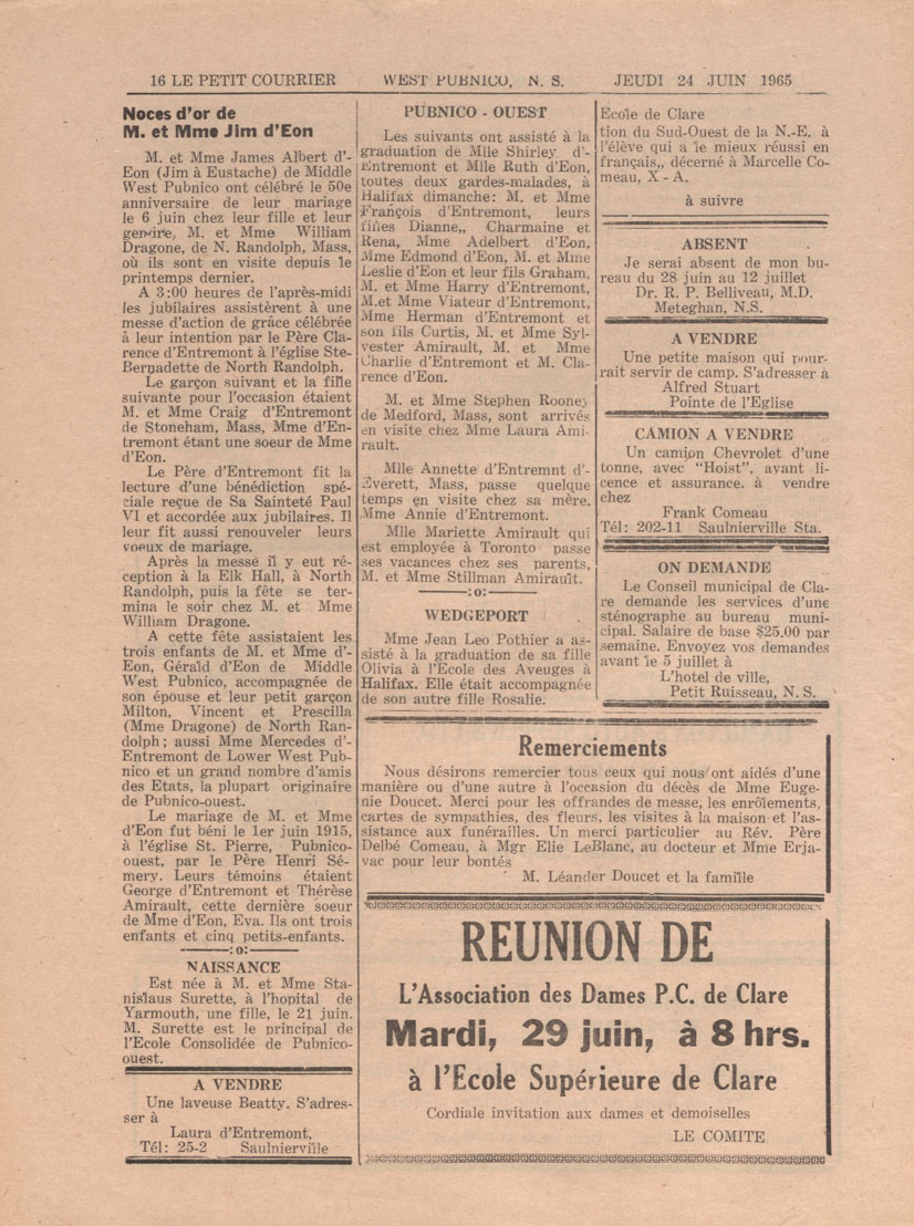 Le Courrier is Nova Scotia's leading French-language newspaper, and the only one with province-wide coverage and distribution. First published by Désiré d'Éon as Le Petit Courrier (Du Sud-Ouest de la Nouvelle-Écosse) on 10 February 1937, it has appeared weekly ever since, informing its readers, defending the interests of Acadians and francophones, and providing a bridge linking all Acadian regions in the province. It offers community news and events, extended articles, advertisements, announcements, photographs and special supplements, all directed towards supporting Nova Scotia's large, dispersed and diversified Acadian population, its businesses, industries, economy, daily activities, schools and higher education, politics, cultural life and heritage. Le Courrier offers an outstanding and unparalleled perspective on 66 years' accumulated history of Nova Scotia's Acadian population, thus enabling exploration of interests, activities, accomplishments, concerns and community issues across a broad swath of the 20th century.