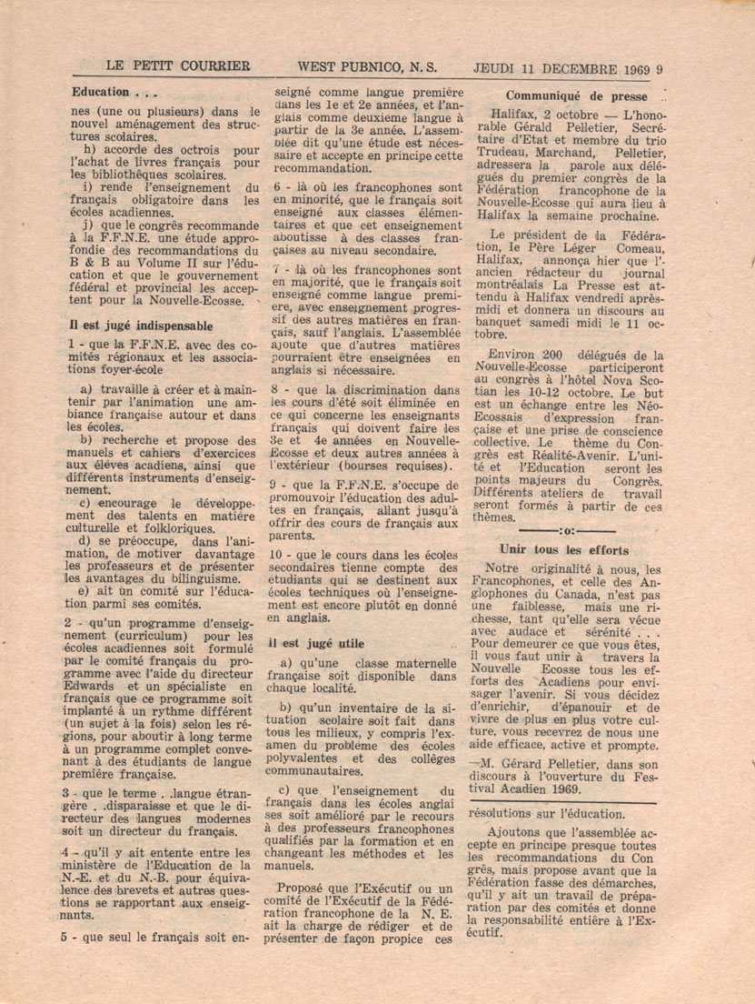 Le Courrier is Nova Scotia's leading French-language newspaper, and the only one with province-wide coverage and distribution. First published by Désiré d'Éon as Le Petit Courrier (Du Sud-Ouest de la Nouvelle-Écosse) on 10 February 1937, it has appeared weekly ever since, informing its readers, defending the interests of Acadians and francophones, and providing a bridge linking all Acadian regions in the province. It offers community news and events, extended articles, advertisements, announcements, photographs and special supplements, all directed towards supporting Nova Scotia's large, dispersed and diversified Acadian population, its businesses, industries, economy, daily activities, schools and higher education, politics, cultural life and heritage. Le Courrier offers an outstanding and unparalleled perspective on 66 years' accumulated history of Nova Scotia's Acadian population, thus enabling exploration of interests, activities, accomplishments, concerns and community issues across a broad swath of the 20th century.