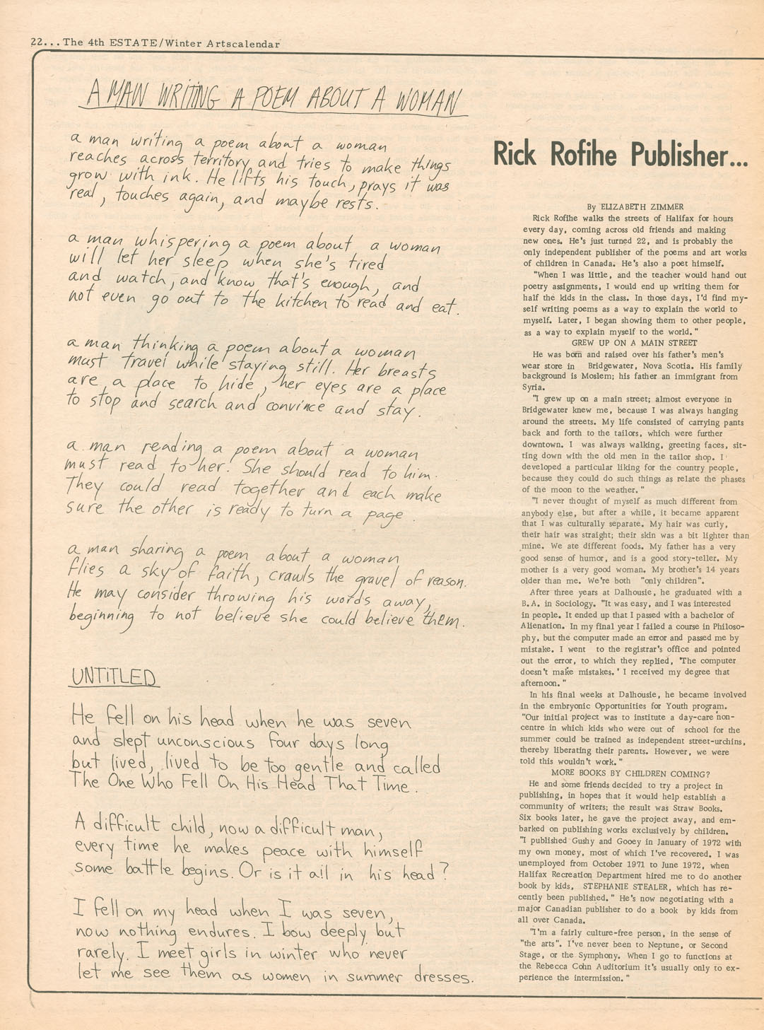 From its first issue on 17 April 1969, The 4th Estate established itself as the independent 'second viewpoint….[and] questioning voice in print in our city and province.' Near the end, in January 1977, publisher Brenda Large wrote, 'The 4th Estate really shouldn't exist at all. All the odds are against it and continue to be against it. But it has survived for eight years due to the work of Nick Fillmore and others who have contributed to the paper and have been loyal readers over the years.' Progressive, radical and provocative, The 4th Estate focused on the issues that mattered in late 20th century Nova Scotia — and which continue to matter to this day.