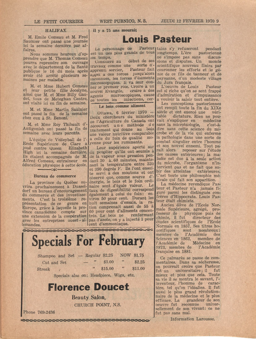 Le Courrier is Nova Scotia's leading French-language newspaper, and the only one with province-wide coverage and distribution. First published by Désiré d'Éon as Le Petit Courrier (Du Sud-Ouest de la Nouvelle-Écosse) on 10 February 1937, it has appeared weekly ever since, informing its readers, defending the interests of Acadians and francophones, and providing a bridge linking all Acadian regions in the province. It offers community news and events, extended articles, advertisements, announcements, photographs and special supplements, all directed towards supporting Nova Scotia's large, dispersed and diversified Acadian population, its businesses, industries, economy, daily activities, schools and higher education, politics, cultural life and heritage. Le Courrier offers an outstanding and unparalleled perspective on 66 years' accumulated history of Nova Scotia's Acadian population, thus enabling exploration of interests, activities, accomplishments, concerns and community issues across a broad swath of the 20th century.
