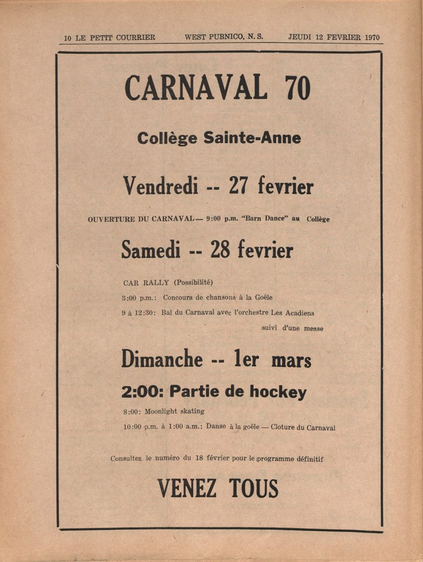 Le Courrier is Nova Scotia's leading French-language newspaper, and the only one with province-wide coverage and distribution. First published by Désiré d'Éon as Le Petit Courrier (Du Sud-Ouest de la Nouvelle-Écosse) on 10 February 1937, it has appeared weekly ever since, informing its readers, defending the interests of Acadians and francophones, and providing a bridge linking all Acadian regions in the province. It offers community news and events, extended articles, advertisements, announcements, photographs and special supplements, all directed towards supporting Nova Scotia's large, dispersed and diversified Acadian population, its businesses, industries, economy, daily activities, schools and higher education, politics, cultural life and heritage. Le Courrier offers an outstanding and unparalleled perspective on 66 years' accumulated history of Nova Scotia's Acadian population, thus enabling exploration of interests, activities, accomplishments, concerns and community issues across a broad swath of the 20th century.