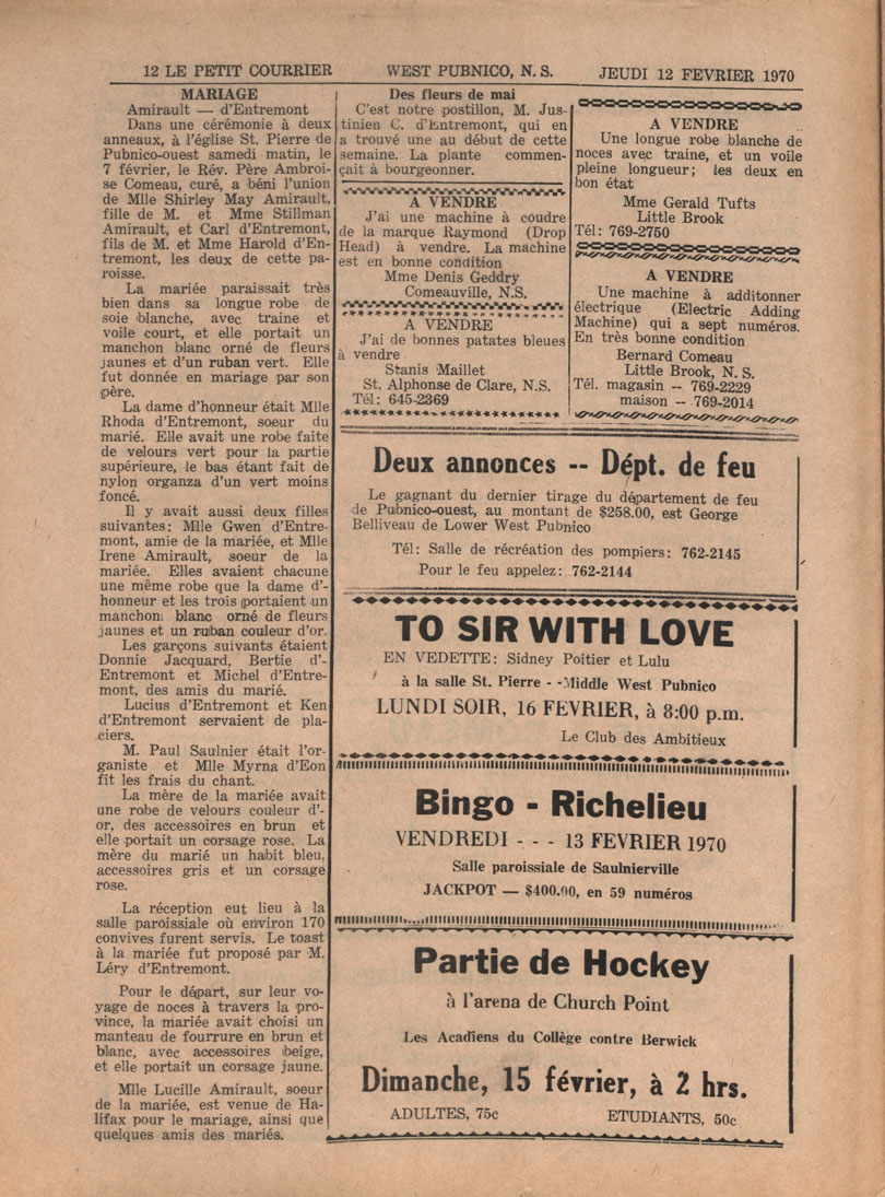 Le Courrier is Nova Scotia's leading French-language newspaper, and the only one with province-wide coverage and distribution. First published by Désiré d'Éon as Le Petit Courrier (Du Sud-Ouest de la Nouvelle-Écosse) on 10 February 1937, it has appeared weekly ever since, informing its readers, defending the interests of Acadians and francophones, and providing a bridge linking all Acadian regions in the province. It offers community news and events, extended articles, advertisements, announcements, photographs and special supplements, all directed towards supporting Nova Scotia's large, dispersed and diversified Acadian population, its businesses, industries, economy, daily activities, schools and higher education, politics, cultural life and heritage. Le Courrier offers an outstanding and unparalleled perspective on 66 years' accumulated history of Nova Scotia's Acadian population, thus enabling exploration of interests, activities, accomplishments, concerns and community issues across a broad swath of the 20th century.