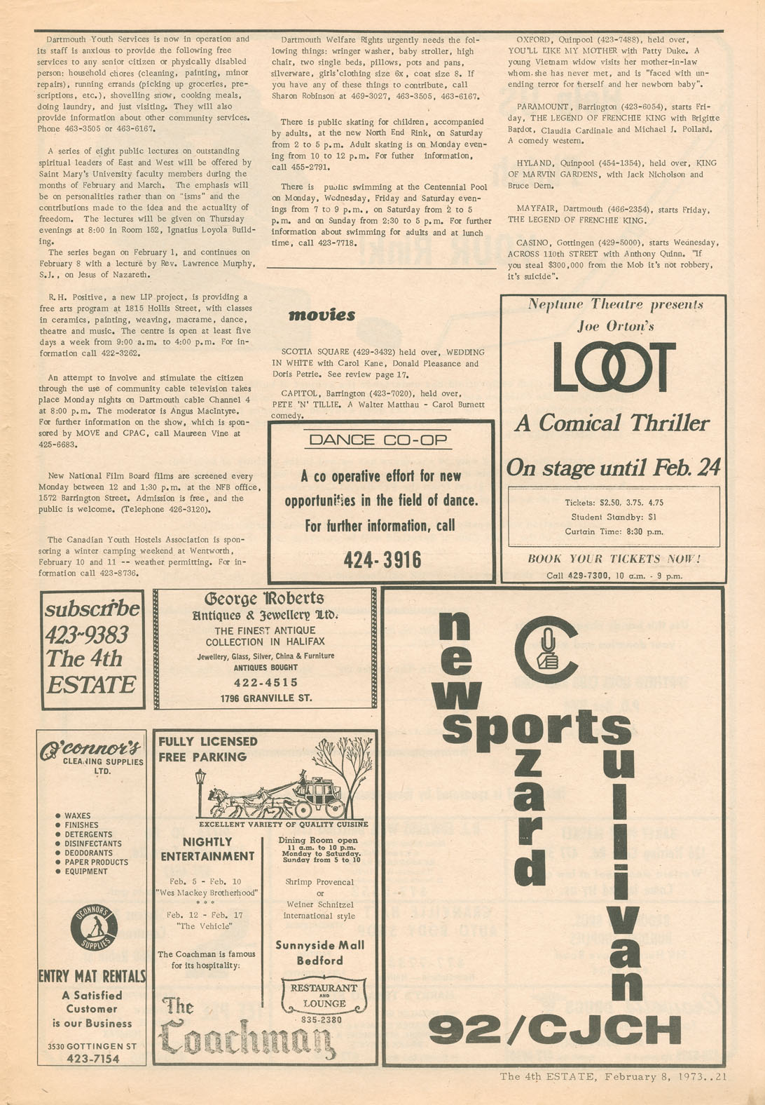 From its first issue on 17 April 1969, The 4th Estate established itself as the independent 'second viewpoint….[and] questioning voice in print in our city and province.' Near the end, in January 1977, publisher Brenda Large wrote, 'The 4th Estate really shouldn't exist at all. All the odds are against it and continue to be against it. But it has survived for eight years due to the work of Nick Fillmore and others who have contributed to the paper and have been loyal readers over the years.' Progressive, radical and provocative, The 4th Estate focused on the issues that mattered in late 20th century Nova Scotia — and which continue to matter to this day.