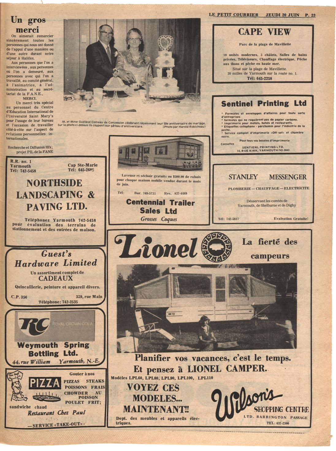 Le Courrier is Nova Scotia's leading French-language newspaper, and the only one with province-wide coverage and distribution. First published by Désiré d'Éon as Le Petit Courrier (Du Sud-Ouest de la Nouvelle-Écosse) on 10 February 1937, it has appeared weekly ever since, informing its readers, defending the interests of Acadians and francophones, and providing a bridge linking all Acadian regions in the province. It offers community news and events, extended articles, advertisements, announcements, photographs and special supplements, all directed towards supporting Nova Scotia's large, dispersed and diversified Acadian population, its businesses, industries, economy, daily activities, schools and higher education, politics, cultural life and heritage. Le Courrier offers an outstanding and unparalleled perspective on 66 years' accumulated history of Nova Scotia's Acadian population, thus enabling exploration of interests, activities, accomplishments, concerns and community issues across a broad swath of the 20th century.
