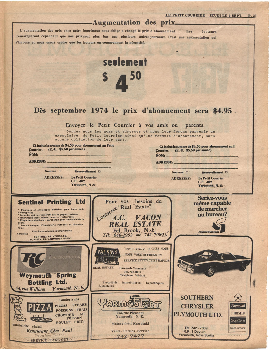Le Courrier is Nova Scotia's leading French-language newspaper, and the only one with province-wide coverage and distribution. First published by Désiré d'Éon as Le Petit Courrier (Du Sud-Ouest de la Nouvelle-Écosse) on 10 February 1937, it has appeared weekly ever since, informing its readers, defending the interests of Acadians and francophones, and providing a bridge linking all Acadian regions in the province. It offers community news and events, extended articles, advertisements, announcements, photographs and special supplements, all directed towards supporting Nova Scotia's large, dispersed and diversified Acadian population, its businesses, industries, economy, daily activities, schools and higher education, politics, cultural life and heritage. Le Courrier offers an outstanding and unparalleled perspective on 66 years' accumulated history of Nova Scotia's Acadian population, thus enabling exploration of interests, activities, accomplishments, concerns and community issues across a broad swath of the 20th century.