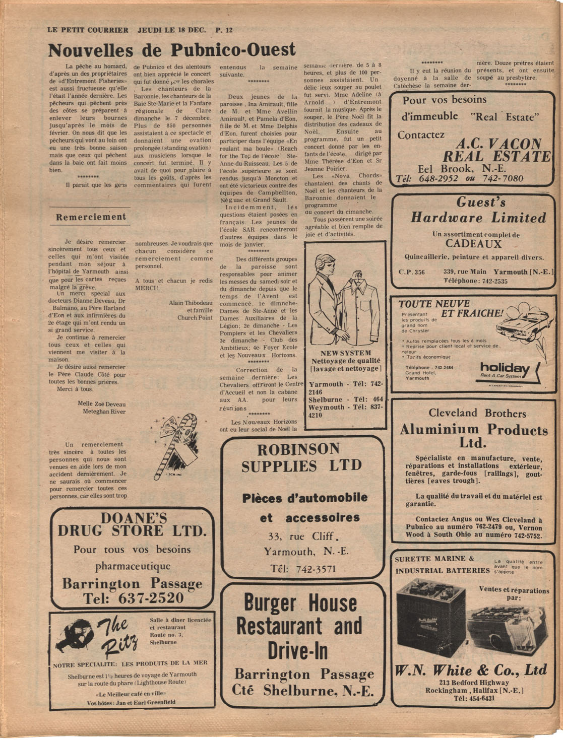 Le Courrier is Nova Scotia's leading French-language newspaper, and the only one with province-wide coverage and distribution. First published by Désiré d'Éon as Le Petit Courrier (Du Sud-Ouest de la Nouvelle-Écosse) on 10 February 1937, it has appeared weekly ever since, informing its readers, defending the interests of Acadians and francophones, and providing a bridge linking all Acadian regions in the province. It offers community news and events, extended articles, advertisements, announcements, photographs and special supplements, all directed towards supporting Nova Scotia's large, dispersed and diversified Acadian population, its businesses, industries, economy, daily activities, schools and higher education, politics, cultural life and heritage. Le Courrier offers an outstanding and unparalleled perspective on 66 years' accumulated history of Nova Scotia's Acadian population, thus enabling exploration of interests, activities, accomplishments, concerns and community issues across a broad swath of the 20th century.