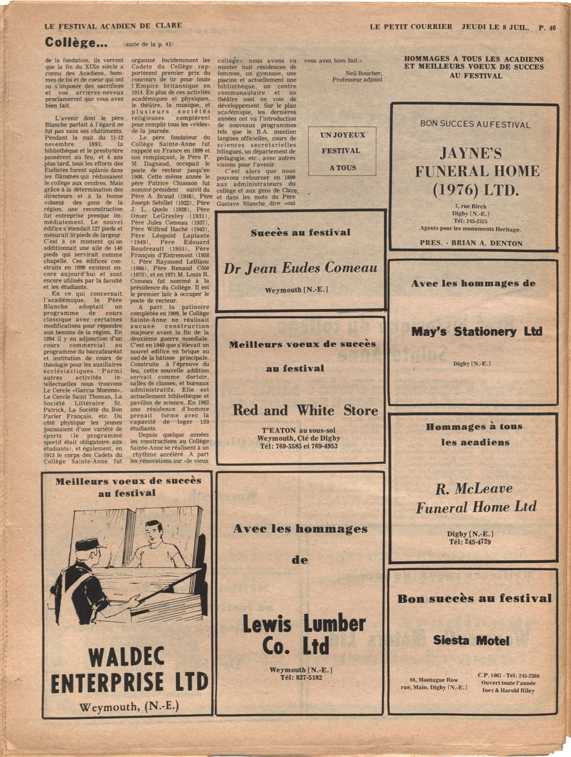 Le Courrier is Nova Scotia's leading French-language newspaper, and the only one with province-wide coverage and distribution. First published by Désiré d'Éon as Le Petit Courrier (Du Sud-Ouest de la Nouvelle-Écosse) on 10 February 1937, it has appeared weekly ever since, informing its readers, defending the interests of Acadians and francophones, and providing a bridge linking all Acadian regions in the province. It offers community news and events, extended articles, advertisements, announcements, photographs and special supplements, all directed towards supporting Nova Scotia's large, dispersed and diversified Acadian population, its businesses, industries, economy, daily activities, schools and higher education, politics, cultural life and heritage. Le Courrier offers an outstanding and unparalleled perspective on 66 years' accumulated history of Nova Scotia's Acadian population, thus enabling exploration of interests, activities, accomplishments, concerns and community issues across a broad swath of the 20th century.