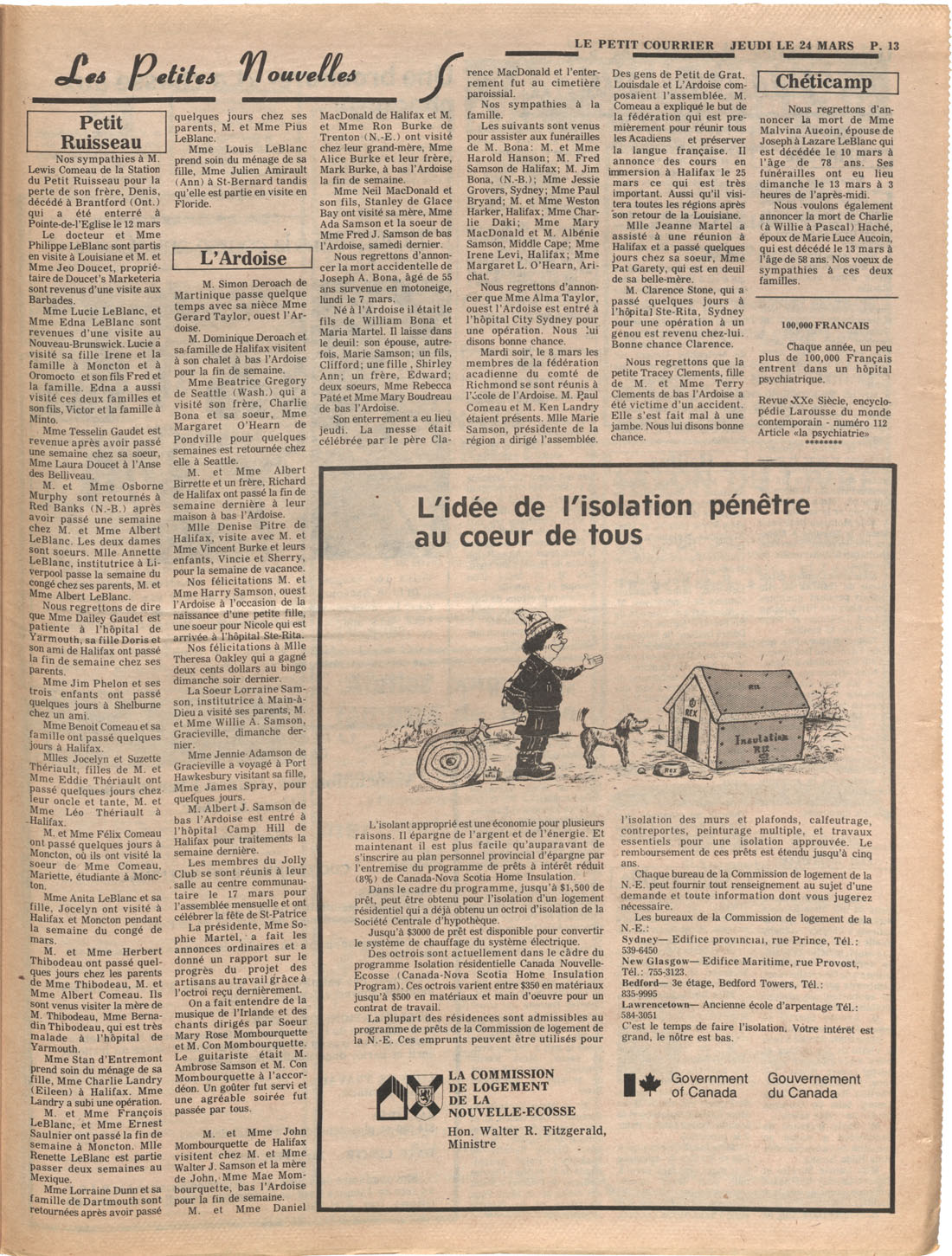 Le Courrier is Nova Scotia's leading French-language newspaper, and the only one with province-wide coverage and distribution. First published by Désiré d'Éon as Le Petit Courrier (Du Sud-Ouest de la Nouvelle-Écosse) on 10 February 1937, it has appeared weekly ever since, informing its readers, defending the interests of Acadians and francophones, and providing a bridge linking all Acadian regions in the province. It offers community news and events, extended articles, advertisements, announcements, photographs and special supplements, all directed towards supporting Nova Scotia's large, dispersed and diversified Acadian population, its businesses, industries, economy, daily activities, schools and higher education, politics, cultural life and heritage. Le Courrier offers an outstanding and unparalleled perspective on 66 years' accumulated history of Nova Scotia's Acadian population, thus enabling exploration of interests, activities, accomplishments, concerns and community issues across a broad swath of the 20th century.