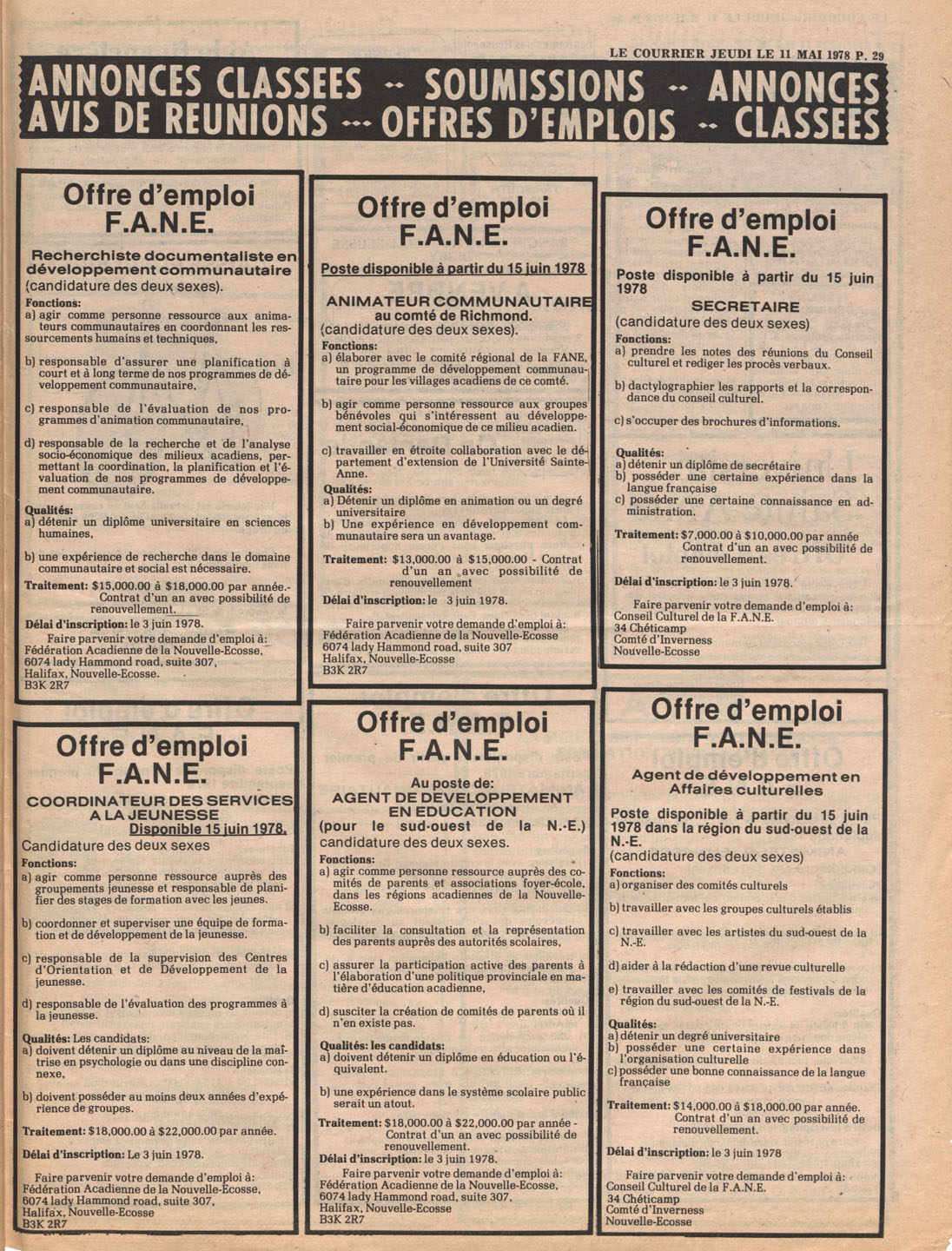 Le Courrier is Nova Scotia's leading French-language newspaper, and the only one with province-wide coverage and distribution. First published by Désiré d'Éon as Le Petit Courrier (Du Sud-Ouest de la Nouvelle-Écosse) on 10 February 1937, it has appeared weekly ever since, informing its readers, defending the interests of Acadians and francophones, and providing a bridge linking all Acadian regions in the province. It offers community news and events, extended articles, advertisements, announcements, photographs and special supplements, all directed towards supporting Nova Scotia's large, dispersed and diversified Acadian population, its businesses, industries, economy, daily activities, schools and higher education, politics, cultural life and heritage. Le Courrier offers an outstanding and unparalleled perspective on 66 years' accumulated history of Nova Scotia's Acadian population, thus enabling exploration of interests, activities, accomplishments, concerns and community issues across a broad swath of the 20th century.