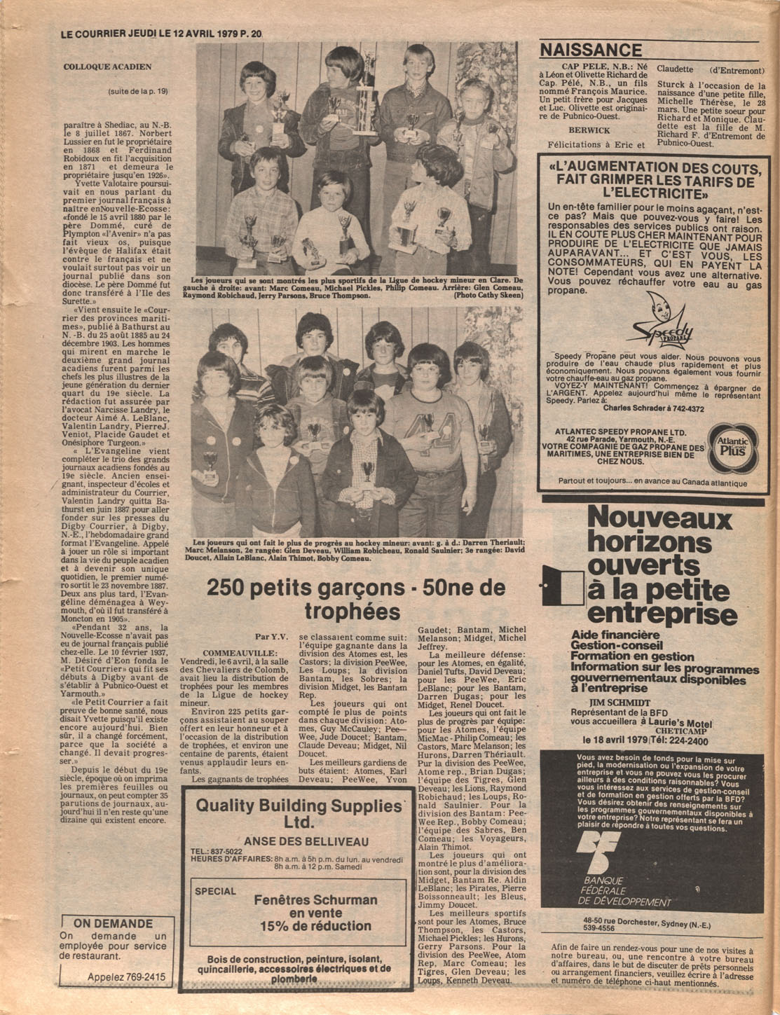 Le Courrier is Nova Scotia's leading French-language newspaper, and the only one with province-wide coverage and distribution. First published by Désiré d'Éon as Le Petit Courrier (Du Sud-Ouest de la Nouvelle-Écosse) on 10 February 1937, it has appeared weekly ever since, informing its readers, defending the interests of Acadians and francophones, and providing a bridge linking all Acadian regions in the province. It offers community news and events, extended articles, advertisements, announcements, photographs and special supplements, all directed towards supporting Nova Scotia's large, dispersed and diversified Acadian population, its businesses, industries, economy, daily activities, schools and higher education, politics, cultural life and heritage. Le Courrier offers an outstanding and unparalleled perspective on 66 years' accumulated history of Nova Scotia's Acadian population, thus enabling exploration of interests, activities, accomplishments, concerns and community issues across a broad swath of the 20th century.