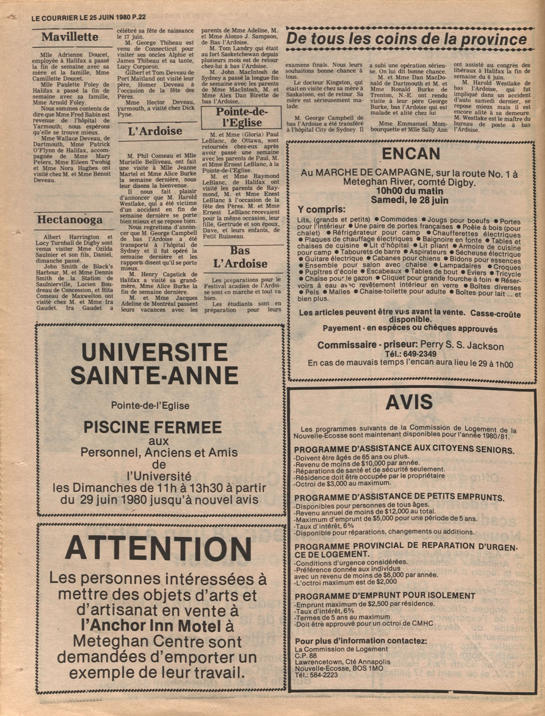Le Courrier is Nova Scotia's leading French-language newspaper, and the only one with province-wide coverage and distribution. First published by Désiré d'Éon as Le Petit Courrier (Du Sud-Ouest de la Nouvelle-Écosse) on 10 February 1937, it has appeared weekly ever since, informing its readers, defending the interests of Acadians and francophones, and providing a bridge linking all Acadian regions in the province. It offers community news and events, extended articles, advertisements, announcements, photographs and special supplements, all directed towards supporting Nova Scotia's large, dispersed and diversified Acadian population, its businesses, industries, economy, daily activities, schools and higher education, politics, cultural life and heritage. Le Courrier offers an outstanding and unparalleled perspective on 66 years' accumulated history of Nova Scotia's Acadian population, thus enabling exploration of interests, activities, accomplishments, concerns and community issues across a broad swath of the 20th century.