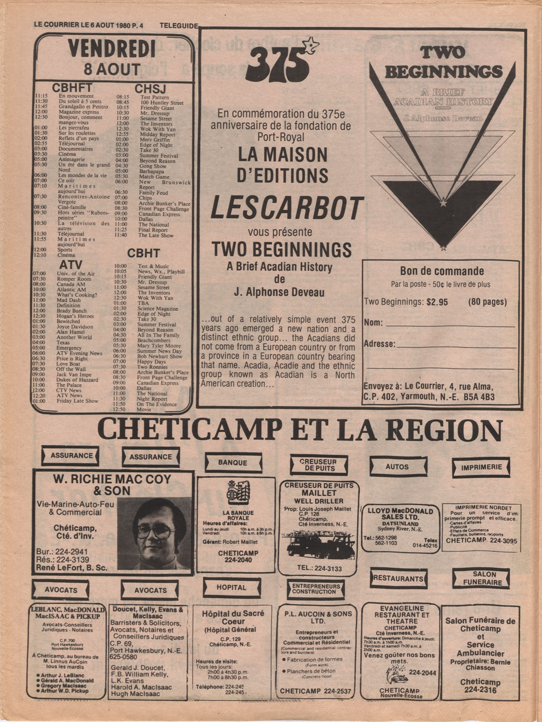 Le Courrier is Nova Scotia's leading French-language newspaper, and the only one with province-wide coverage and distribution. First published by Désiré d'Éon as Le Petit Courrier (Du Sud-Ouest de la Nouvelle-Écosse) on 10 February 1937, it has appeared weekly ever since, informing its readers, defending the interests of Acadians and francophones, and providing a bridge linking all Acadian regions in the province. It offers community news and events, extended articles, advertisements, announcements, photographs and special supplements, all directed towards supporting Nova Scotia's large, dispersed and diversified Acadian population, its businesses, industries, economy, daily activities, schools and higher education, politics, cultural life and heritage. Le Courrier offers an outstanding and unparalleled perspective on 66 years' accumulated history of Nova Scotia's Acadian population, thus enabling exploration of interests, activities, accomplishments, concerns and community issues across a broad swath of the 20th century.