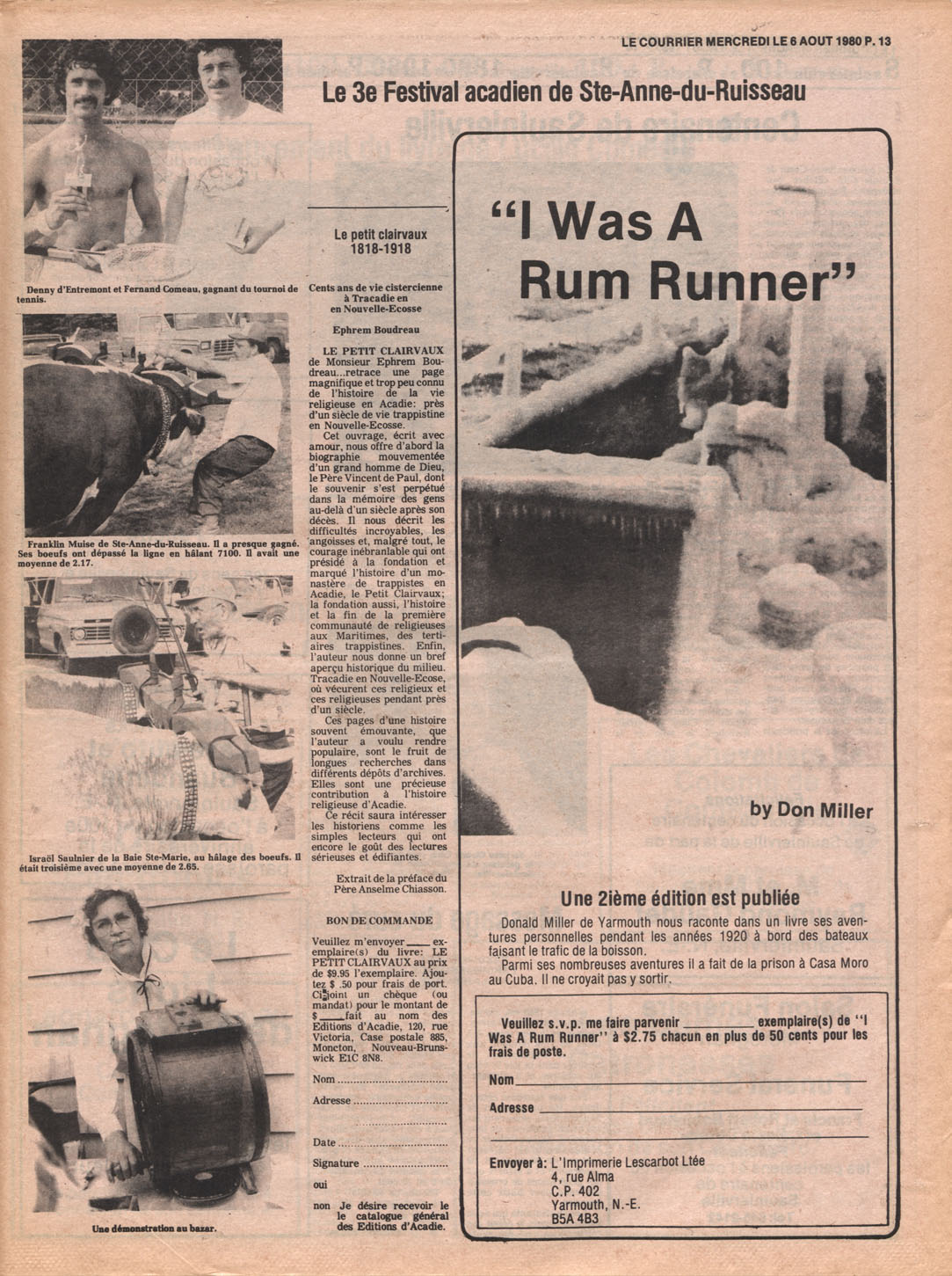 Le Courrier is Nova Scotia's leading French-language newspaper, and the only one with province-wide coverage and distribution. First published by Désiré d'Éon as Le Petit Courrier (Du Sud-Ouest de la Nouvelle-Écosse) on 10 February 1937, it has appeared weekly ever since, informing its readers, defending the interests of Acadians and francophones, and providing a bridge linking all Acadian regions in the province. It offers community news and events, extended articles, advertisements, announcements, photographs and special supplements, all directed towards supporting Nova Scotia's large, dispersed and diversified Acadian population, its businesses, industries, economy, daily activities, schools and higher education, politics, cultural life and heritage. Le Courrier offers an outstanding and unparalleled perspective on 66 years' accumulated history of Nova Scotia's Acadian population, thus enabling exploration of interests, activities, accomplishments, concerns and community issues across a broad swath of the 20th century.