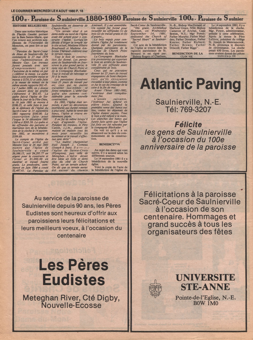 Le Courrier is Nova Scotia's leading French-language newspaper, and the only one with province-wide coverage and distribution. First published by Désiré d'Éon as Le Petit Courrier (Du Sud-Ouest de la Nouvelle-Écosse) on 10 February 1937, it has appeared weekly ever since, informing its readers, defending the interests of Acadians and francophones, and providing a bridge linking all Acadian regions in the province. It offers community news and events, extended articles, advertisements, announcements, photographs and special supplements, all directed towards supporting Nova Scotia's large, dispersed and diversified Acadian population, its businesses, industries, economy, daily activities, schools and higher education, politics, cultural life and heritage. Le Courrier offers an outstanding and unparalleled perspective on 66 years' accumulated history of Nova Scotia's Acadian population, thus enabling exploration of interests, activities, accomplishments, concerns and community issues across a broad swath of the 20th century.