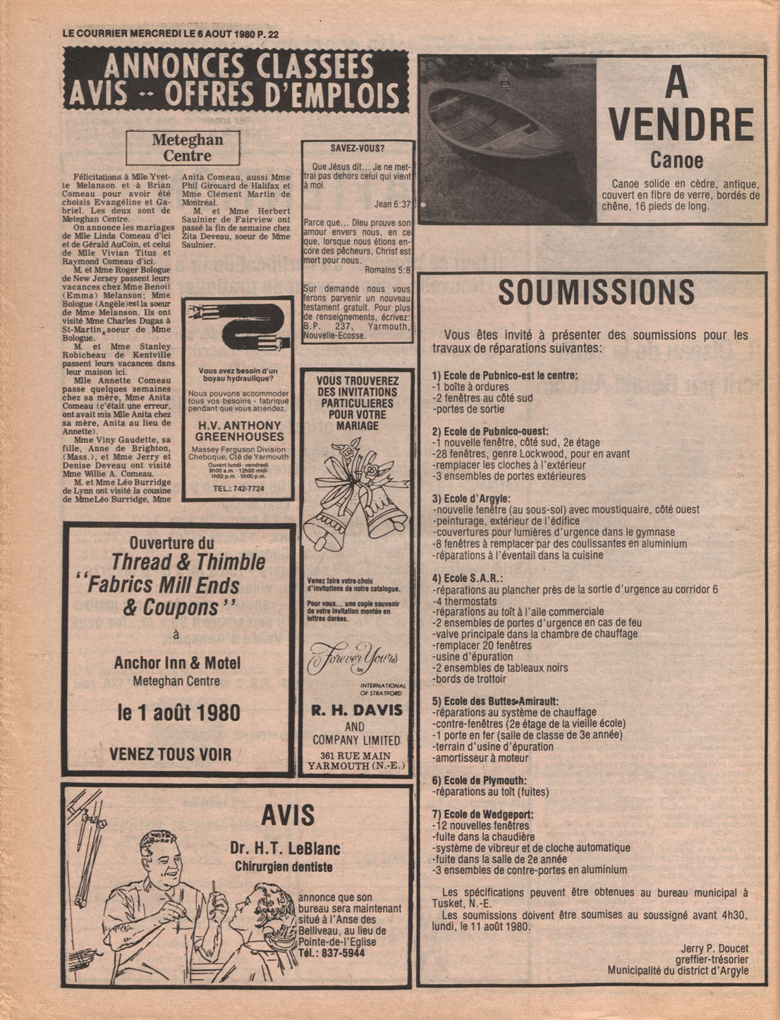 Le Courrier is Nova Scotia's leading French-language newspaper, and the only one with province-wide coverage and distribution. First published by Désiré d'Éon as Le Petit Courrier (Du Sud-Ouest de la Nouvelle-Écosse) on 10 February 1937, it has appeared weekly ever since, informing its readers, defending the interests of Acadians and francophones, and providing a bridge linking all Acadian regions in the province. It offers community news and events, extended articles, advertisements, announcements, photographs and special supplements, all directed towards supporting Nova Scotia's large, dispersed and diversified Acadian population, its businesses, industries, economy, daily activities, schools and higher education, politics, cultural life and heritage. Le Courrier offers an outstanding and unparalleled perspective on 66 years' accumulated history of Nova Scotia's Acadian population, thus enabling exploration of interests, activities, accomplishments, concerns and community issues across a broad swath of the 20th century.