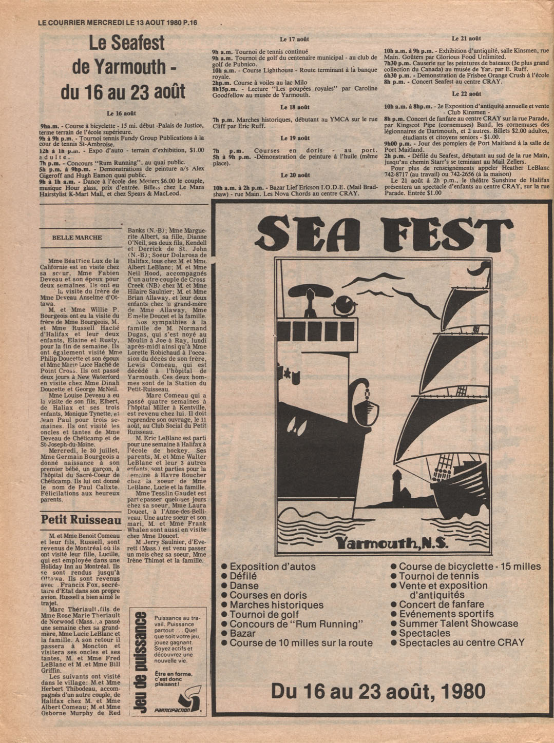 Le Courrier is Nova Scotia's leading French-language newspaper, and the only one with province-wide coverage and distribution. First published by Désiré d'Éon as Le Petit Courrier (Du Sud-Ouest de la Nouvelle-Écosse) on 10 February 1937, it has appeared weekly ever since, informing its readers, defending the interests of Acadians and francophones, and providing a bridge linking all Acadian regions in the province. It offers community news and events, extended articles, advertisements, announcements, photographs and special supplements, all directed towards supporting Nova Scotia's large, dispersed and diversified Acadian population, its businesses, industries, economy, daily activities, schools and higher education, politics, cultural life and heritage. Le Courrier offers an outstanding and unparalleled perspective on 66 years' accumulated history of Nova Scotia's Acadian population, thus enabling exploration of interests, activities, accomplishments, concerns and community issues across a broad swath of the 20th century.