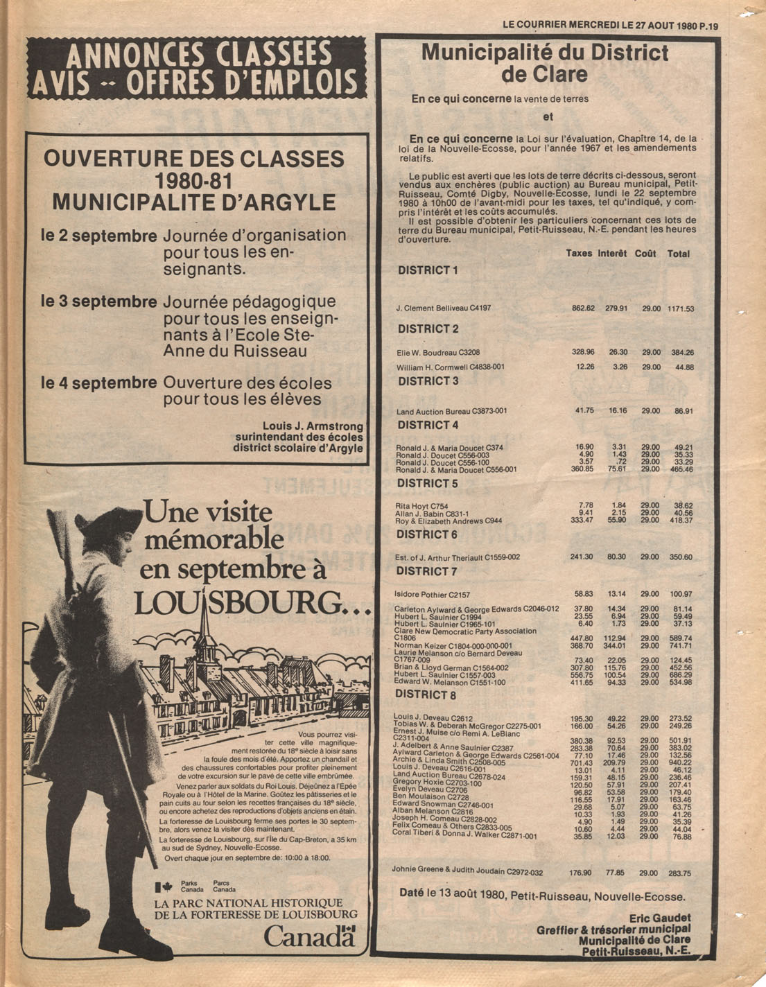 Le Courrier is Nova Scotia's leading French-language newspaper, and the only one with province-wide coverage and distribution. First published by Désiré d'Éon as Le Petit Courrier (Du Sud-Ouest de la Nouvelle-Écosse) on 10 February 1937, it has appeared weekly ever since, informing its readers, defending the interests of Acadians and francophones, and providing a bridge linking all Acadian regions in the province. It offers community news and events, extended articles, advertisements, announcements, photographs and special supplements, all directed towards supporting Nova Scotia's large, dispersed and diversified Acadian population, its businesses, industries, economy, daily activities, schools and higher education, politics, cultural life and heritage. Le Courrier offers an outstanding and unparalleled perspective on 66 years' accumulated history of Nova Scotia's Acadian population, thus enabling exploration of interests, activities, accomplishments, concerns and community issues across a broad swath of the 20th century.