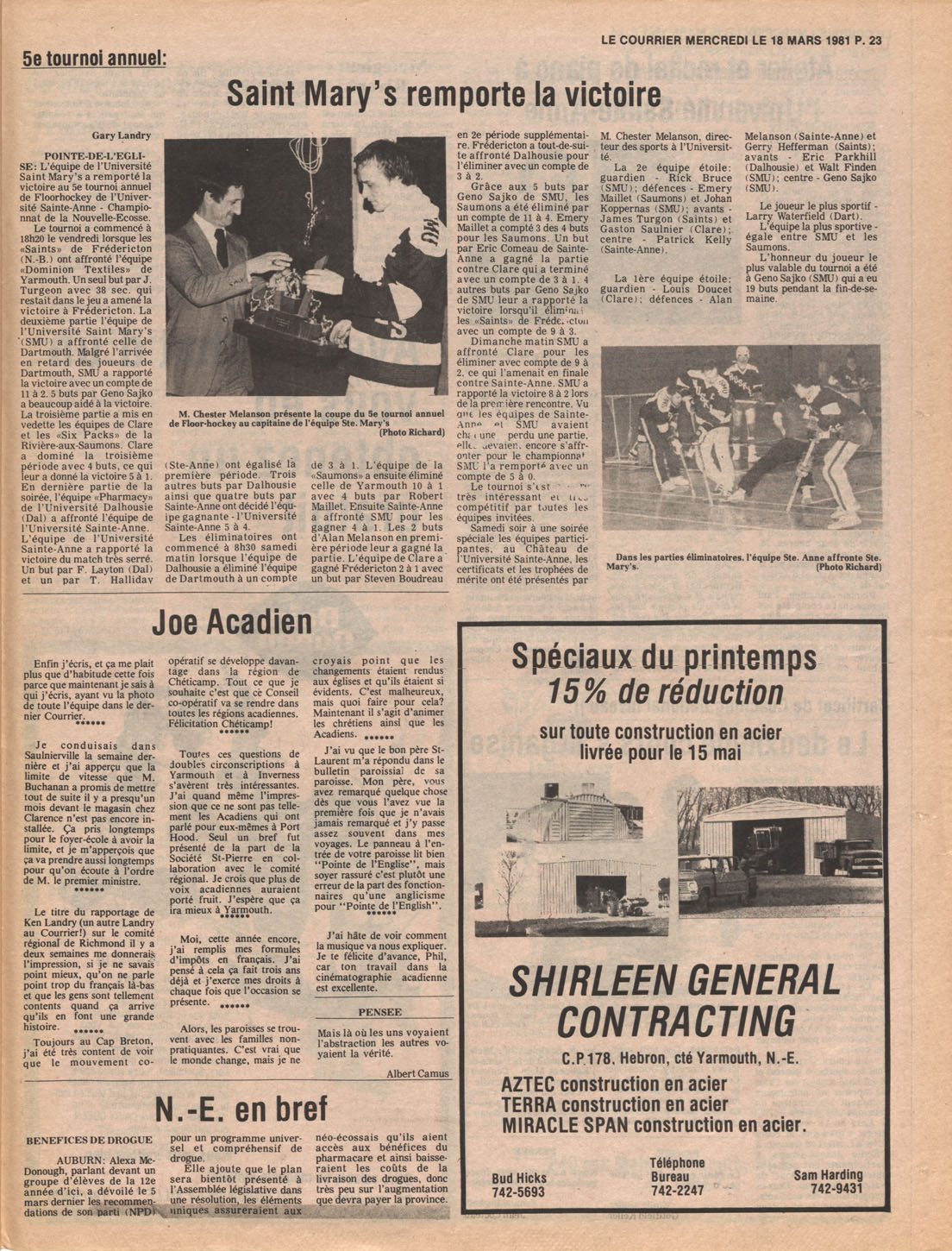 Le Courrier is Nova Scotia's leading French-language newspaper, and the only one with province-wide coverage and distribution. First published by Désiré d'Éon as Le Petit Courrier (Du Sud-Ouest de la Nouvelle-Écosse) on 10 February 1937, it has appeared weekly ever since, informing its readers, defending the interests of Acadians and francophones, and providing a bridge linking all Acadian regions in the province. It offers community news and events, extended articles, advertisements, announcements, photographs and special supplements, all directed towards supporting Nova Scotia's large, dispersed and diversified Acadian population, its businesses, industries, economy, daily activities, schools and higher education, politics, cultural life and heritage. Le Courrier offers an outstanding and unparalleled perspective on 66 years' accumulated history of Nova Scotia's Acadian population, thus enabling exploration of interests, activities, accomplishments, concerns and community issues across a broad swath of the 20th century.