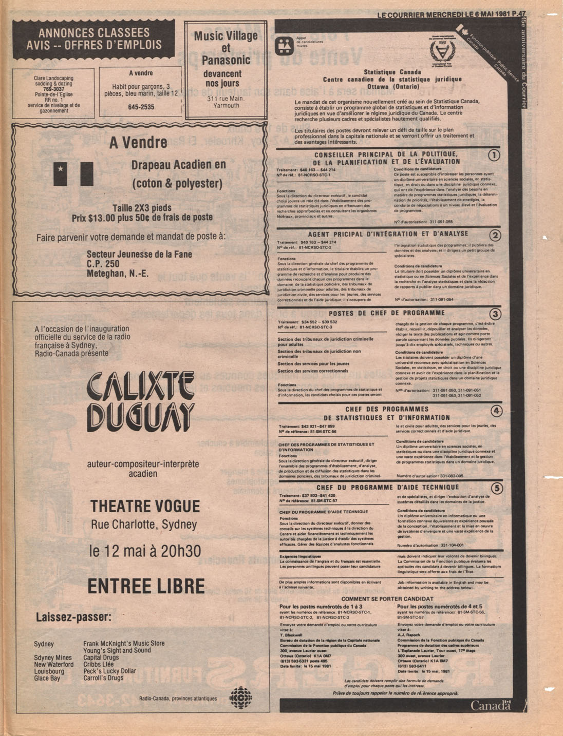 Le Courrier is Nova Scotia's leading French-language newspaper, and the only one with province-wide coverage and distribution. First published by Désiré d'Éon as Le Petit Courrier (Du Sud-Ouest de la Nouvelle-Écosse) on 10 February 1937, it has appeared weekly ever since, informing its readers, defending the interests of Acadians and francophones, and providing a bridge linking all Acadian regions in the province. It offers community news and events, extended articles, advertisements, announcements, photographs and special supplements, all directed towards supporting Nova Scotia's large, dispersed and diversified Acadian population, its businesses, industries, economy, daily activities, schools and higher education, politics, cultural life and heritage. Le Courrier offers an outstanding and unparalleled perspective on 66 years' accumulated history of Nova Scotia's Acadian population, thus enabling exploration of interests, activities, accomplishments, concerns and community issues across a broad swath of the 20th century.