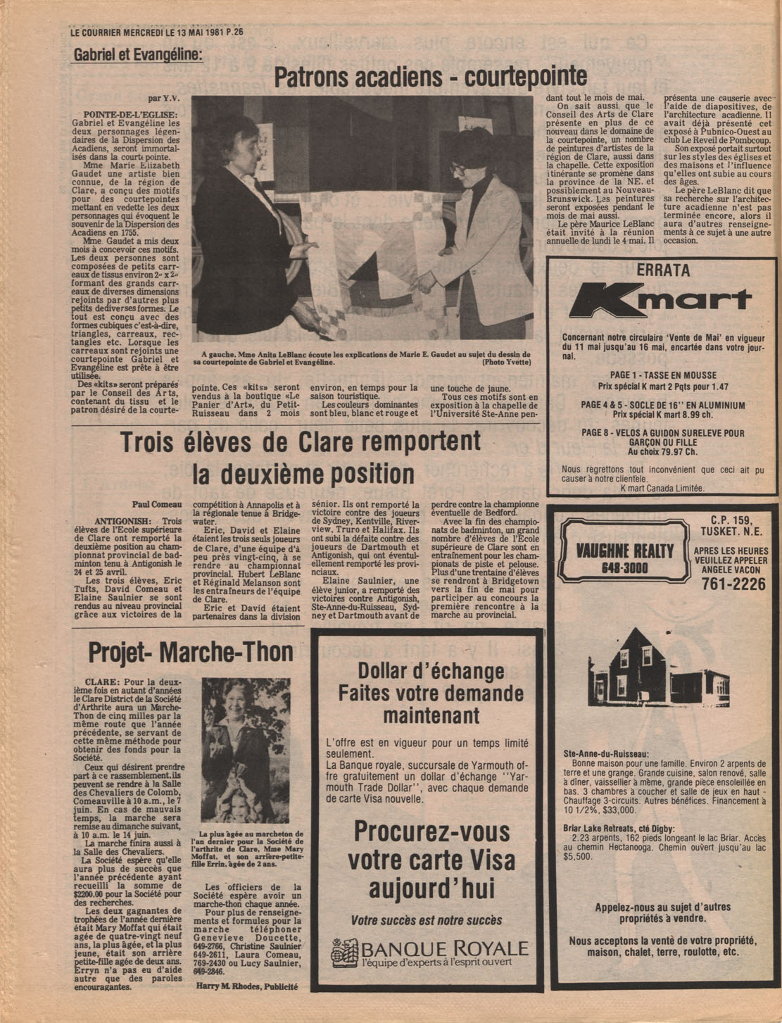 Le Courrier is Nova Scotia's leading French-language newspaper, and the only one with province-wide coverage and distribution. First published by Désiré d'Éon as Le Petit Courrier (Du Sud-Ouest de la Nouvelle-Écosse) on 10 February 1937, it has appeared weekly ever since, informing its readers, defending the interests of Acadians and francophones, and providing a bridge linking all Acadian regions in the province. It offers community news and events, extended articles, advertisements, announcements, photographs and special supplements, all directed towards supporting Nova Scotia's large, dispersed and diversified Acadian population, its businesses, industries, economy, daily activities, schools and higher education, politics, cultural life and heritage. Le Courrier offers an outstanding and unparalleled perspective on 66 years' accumulated history of Nova Scotia's Acadian population, thus enabling exploration of interests, activities, accomplishments, concerns and community issues across a broad swath of the 20th century.