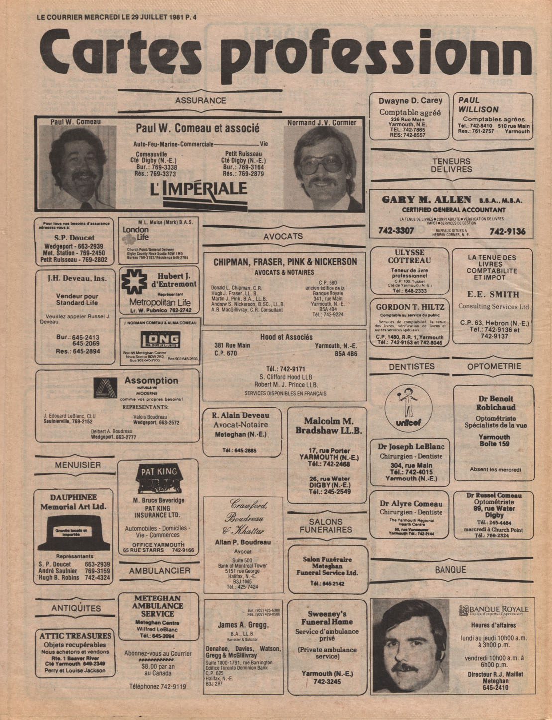 Le Courrier is Nova Scotia's leading French-language newspaper, and the only one with province-wide coverage and distribution. First published by Désiré d'Éon as Le Petit Courrier (Du Sud-Ouest de la Nouvelle-Écosse) on 10 February 1937, it has appeared weekly ever since, informing its readers, defending the interests of Acadians and francophones, and providing a bridge linking all Acadian regions in the province. It offers community news and events, extended articles, advertisements, announcements, photographs and special supplements, all directed towards supporting Nova Scotia's large, dispersed and diversified Acadian population, its businesses, industries, economy, daily activities, schools and higher education, politics, cultural life and heritage. Le Courrier offers an outstanding and unparalleled perspective on 66 years' accumulated history of Nova Scotia's Acadian population, thus enabling exploration of interests, activities, accomplishments, concerns and community issues across a broad swath of the 20th century.