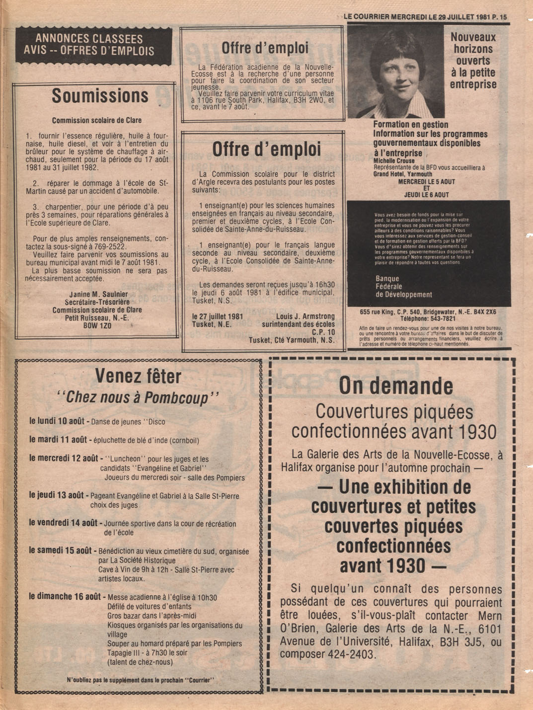 Le Courrier is Nova Scotia's leading French-language newspaper, and the only one with province-wide coverage and distribution. First published by Désiré d'Éon as Le Petit Courrier (Du Sud-Ouest de la Nouvelle-Écosse) on 10 February 1937, it has appeared weekly ever since, informing its readers, defending the interests of Acadians and francophones, and providing a bridge linking all Acadian regions in the province. It offers community news and events, extended articles, advertisements, announcements, photographs and special supplements, all directed towards supporting Nova Scotia's large, dispersed and diversified Acadian population, its businesses, industries, economy, daily activities, schools and higher education, politics, cultural life and heritage. Le Courrier offers an outstanding and unparalleled perspective on 66 years' accumulated history of Nova Scotia's Acadian population, thus enabling exploration of interests, activities, accomplishments, concerns and community issues across a broad swath of the 20th century.