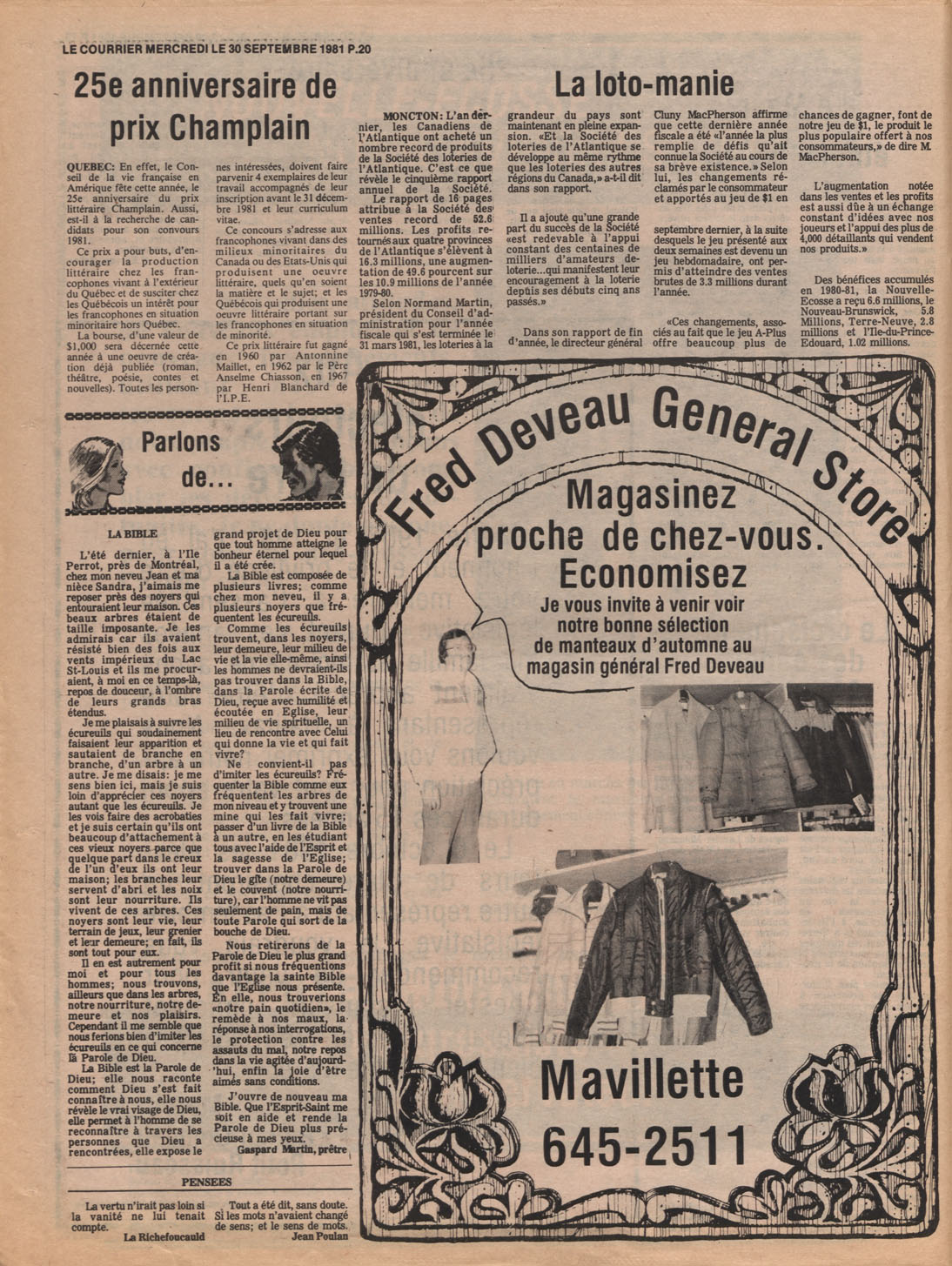Le Courrier is Nova Scotia's leading French-language newspaper, and the only one with province-wide coverage and distribution. First published by Désiré d'Éon as Le Petit Courrier (Du Sud-Ouest de la Nouvelle-Écosse) on 10 February 1937, it has appeared weekly ever since, informing its readers, defending the interests of Acadians and francophones, and providing a bridge linking all Acadian regions in the province. It offers community news and events, extended articles, advertisements, announcements, photographs and special supplements, all directed towards supporting Nova Scotia's large, dispersed and diversified Acadian population, its businesses, industries, economy, daily activities, schools and higher education, politics, cultural life and heritage. Le Courrier offers an outstanding and unparalleled perspective on 66 years' accumulated history of Nova Scotia's Acadian population, thus enabling exploration of interests, activities, accomplishments, concerns and community issues across a broad swath of the 20th century.