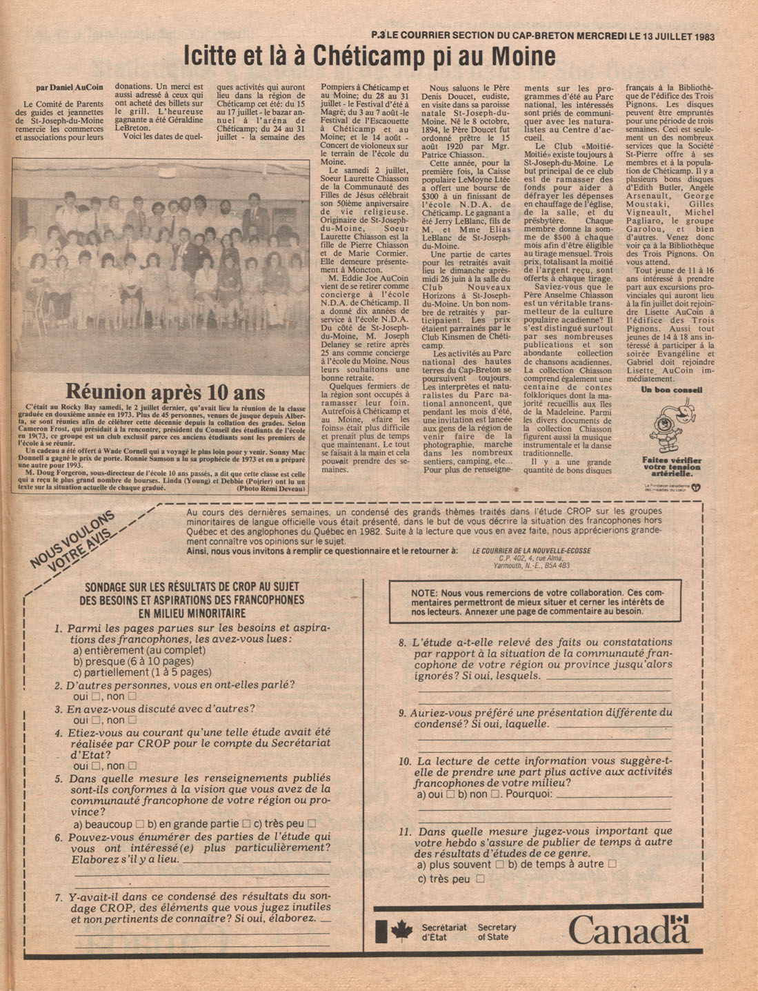 Le Courrier is Nova Scotia's leading French-language newspaper, and the only one with province-wide coverage and distribution. First published by Désiré d'Éon as Le Petit Courrier (Du Sud-Ouest de la Nouvelle-Écosse) on 10 February 1937, it has appeared weekly ever since, informing its readers, defending the interests of Acadians and francophones, and providing a bridge linking all Acadian regions in the province. It offers community news and events, extended articles, advertisements, announcements, photographs and special supplements, all directed towards supporting Nova Scotia's large, dispersed and diversified Acadian population, its businesses, industries, economy, daily activities, schools and higher education, politics, cultural life and heritage. Le Courrier offers an outstanding and unparalleled perspective on 66 years' accumulated history of Nova Scotia's Acadian population, thus enabling exploration of interests, activities, accomplishments, concerns and community issues across a broad swath of the 20th century.