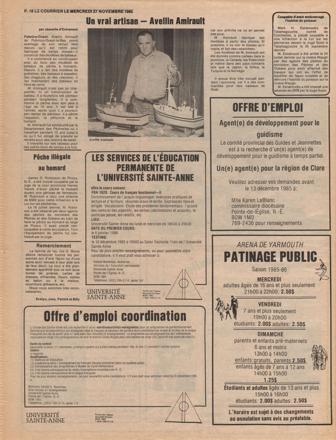 Le Courrier is Nova Scotia's leading French-language newspaper, and the only one with province-wide coverage and distribution. First published by Désiré d'Éon as Le Petit Courrier (Du Sud-Ouest de la Nouvelle-Écosse) on 10 February 1937, it has appeared weekly ever since, informing its readers, defending the interests of Acadians and francophones, and providing a bridge linking all Acadian regions in the province. It offers community news and events, extended articles, advertisements, announcements, photographs and special supplements, all directed towards supporting Nova Scotia's large, dispersed and diversified Acadian population, its businesses, industries, economy, daily activities, schools and higher education, politics, cultural life and heritage. Le Courrier offers an outstanding and unparalleled perspective on 66 years' accumulated history of Nova Scotia's Acadian population, thus enabling exploration of interests, activities, accomplishments, concerns and community issues across a broad swath of the 20th century.