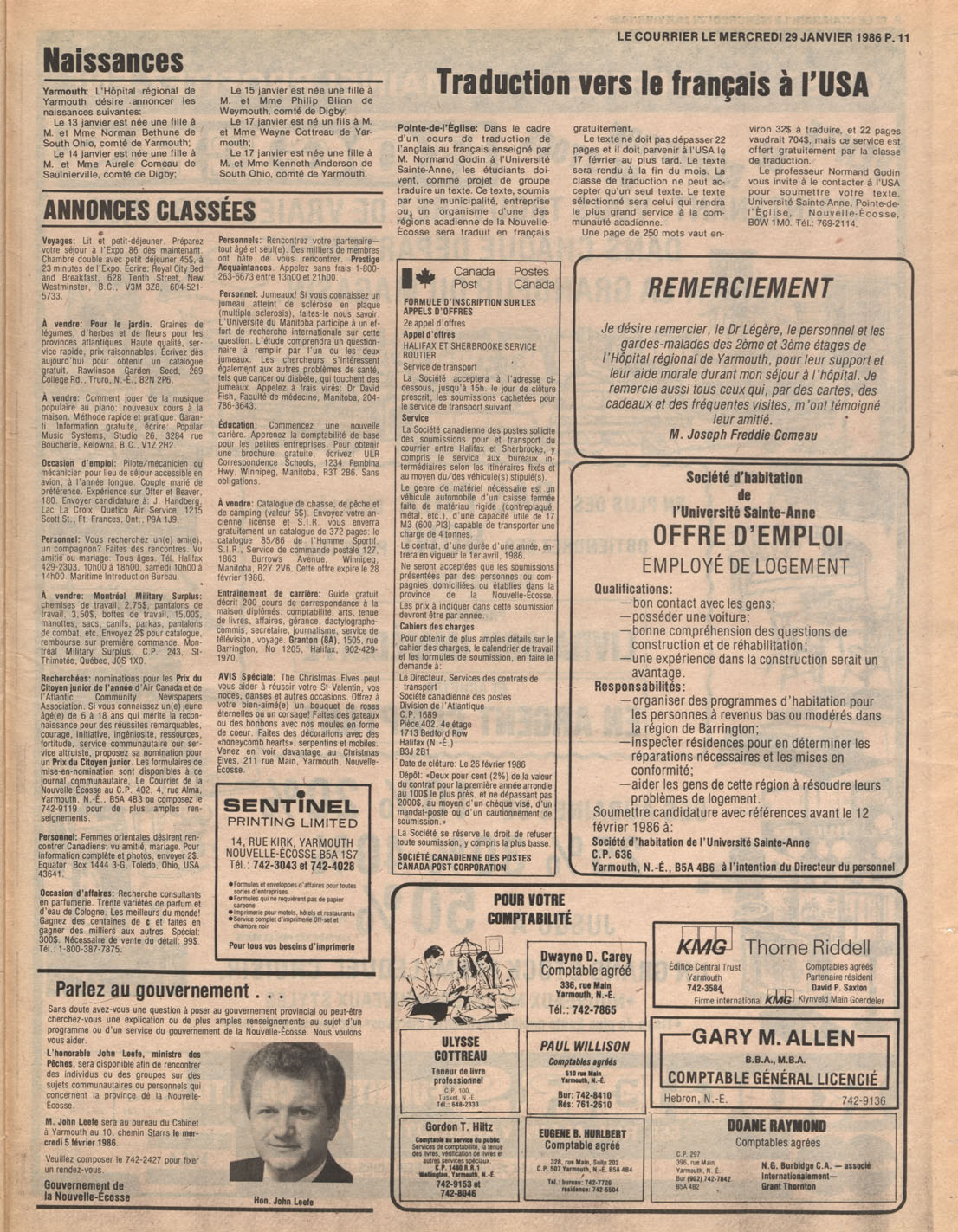 Le Courrier is Nova Scotia's leading French-language newspaper, and the only one with province-wide coverage and distribution. First published by Désiré d'Éon as Le Petit Courrier (Du Sud-Ouest de la Nouvelle-Écosse) on 10 February 1937, it has appeared weekly ever since, informing its readers, defending the interests of Acadians and francophones, and providing a bridge linking all Acadian regions in the province. It offers community news and events, extended articles, advertisements, announcements, photographs and special supplements, all directed towards supporting Nova Scotia's large, dispersed and diversified Acadian population, its businesses, industries, economy, daily activities, schools and higher education, politics, cultural life and heritage. Le Courrier offers an outstanding and unparalleled perspective on 66 years' accumulated history of Nova Scotia's Acadian population, thus enabling exploration of interests, activities, accomplishments, concerns and community issues across a broad swath of the 20th century.