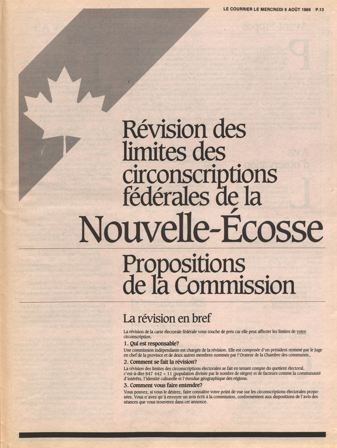 Le Courrier is Nova Scotia's leading French-language newspaper, and the only one with province-wide coverage and distribution. First published by Désiré d'Éon as Le Petit Courrier (Du Sud-Ouest de la Nouvelle-Écosse) on 10 February 1937, it has appeared weekly ever since, informing its readers, defending the interests of Acadians and francophones, and providing a bridge linking all Acadian regions in the province. It offers community news and events, extended articles, advertisements, announcements, photographs and special supplements, all directed towards supporting Nova Scotia's large, dispersed and diversified Acadian population, its businesses, industries, economy, daily activities, schools and higher education, politics, cultural life and heritage. Le Courrier offers an outstanding and unparalleled perspective on 66 years' accumulated history of Nova Scotia's Acadian population, thus enabling exploration of interests, activities, accomplishments, concerns and community issues across a broad swath of the 20th century.