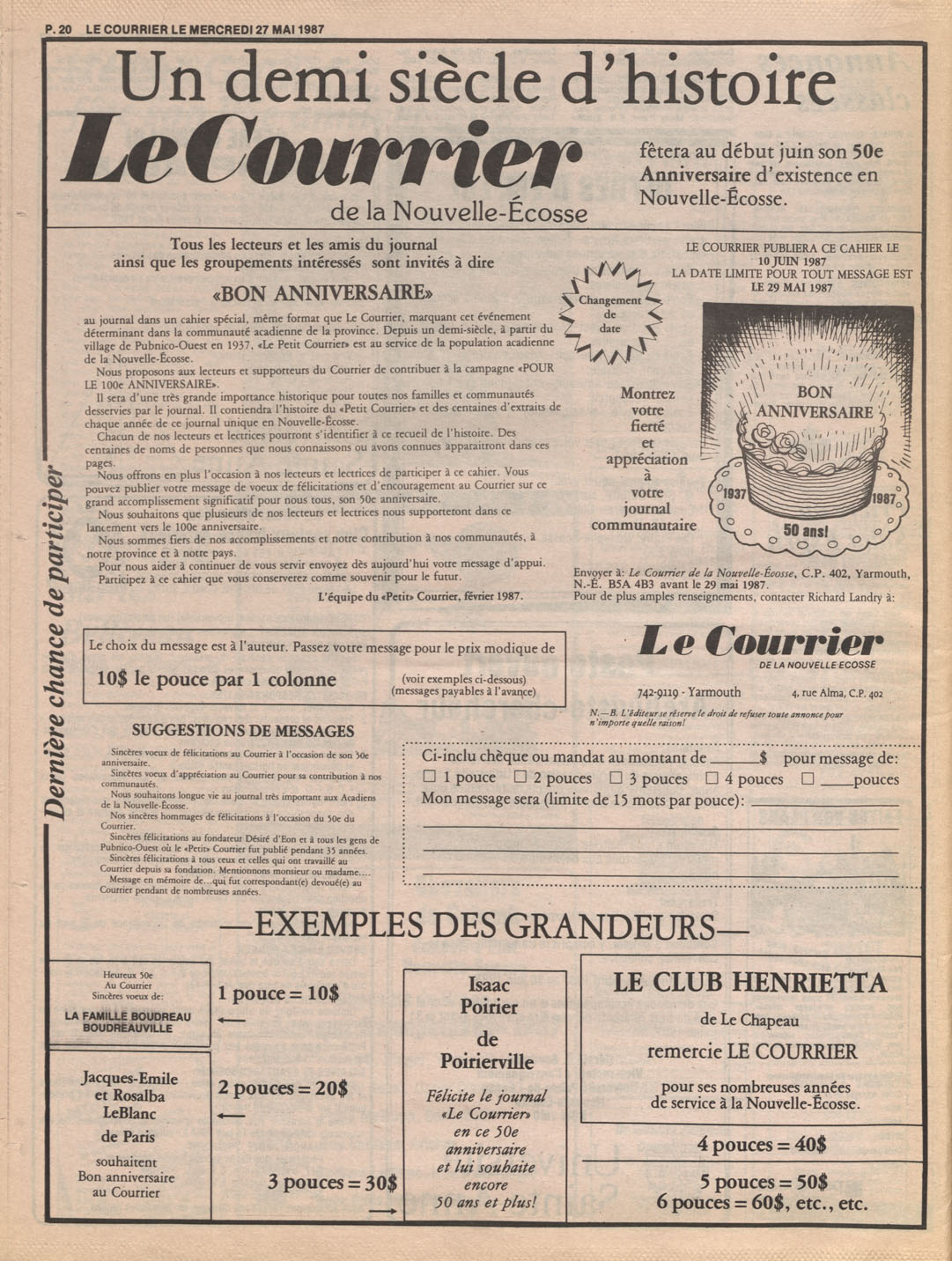 Le Courrier is Nova Scotia's leading French-language newspaper, and the only one with province-wide coverage and distribution. First published by Désiré d'Éon as Le Petit Courrier (Du Sud-Ouest de la Nouvelle-Écosse) on 10 February 1937, it has appeared weekly ever since, informing its readers, defending the interests of Acadians and francophones, and providing a bridge linking all Acadian regions in the province. It offers community news and events, extended articles, advertisements, announcements, photographs and special supplements, all directed towards supporting Nova Scotia's large, dispersed and diversified Acadian population, its businesses, industries, economy, daily activities, schools and higher education, politics, cultural life and heritage. Le Courrier offers an outstanding and unparalleled perspective on 66 years' accumulated history of Nova Scotia's Acadian population, thus enabling exploration of interests, activities, accomplishments, concerns and community issues across a broad swath of the 20th century.