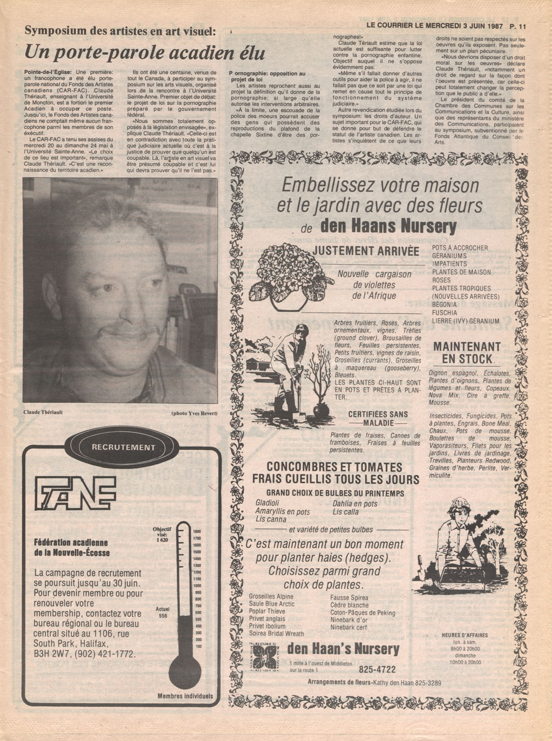 Le Courrier is Nova Scotia's leading French-language newspaper, and the only one with province-wide coverage and distribution. First published by Désiré d'Éon as Le Petit Courrier (Du Sud-Ouest de la Nouvelle-Écosse) on 10 February 1937, it has appeared weekly ever since, informing its readers, defending the interests of Acadians and francophones, and providing a bridge linking all Acadian regions in the province. It offers community news and events, extended articles, advertisements, announcements, photographs and special supplements, all directed towards supporting Nova Scotia's large, dispersed and diversified Acadian population, its businesses, industries, economy, daily activities, schools and higher education, politics, cultural life and heritage. Le Courrier offers an outstanding and unparalleled perspective on 66 years' accumulated history of Nova Scotia's Acadian population, thus enabling exploration of interests, activities, accomplishments, concerns and community issues across a broad swath of the 20th century.