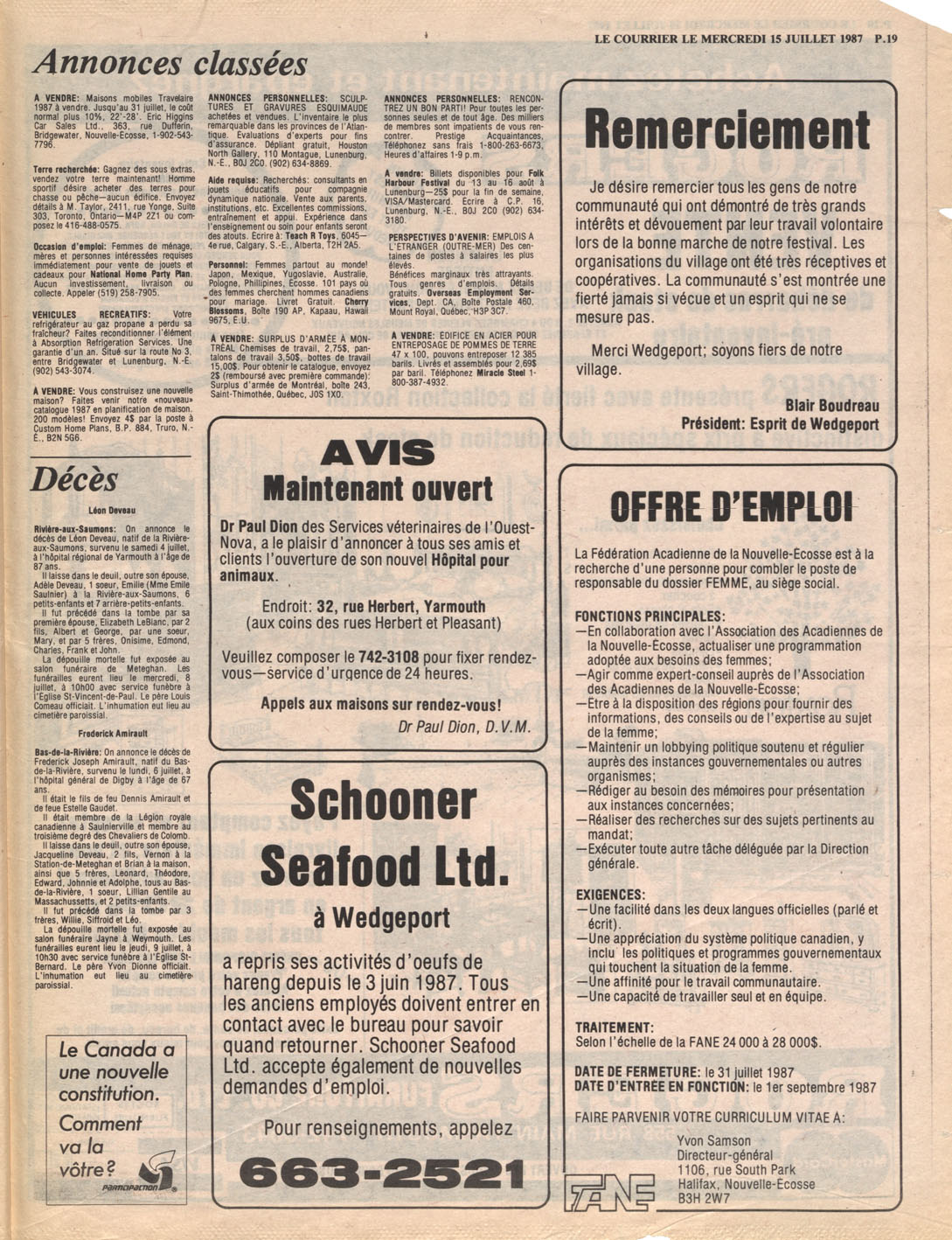 Le Courrier is Nova Scotia's leading French-language newspaper, and the only one with province-wide coverage and distribution. First published by Désiré d'Éon as Le Petit Courrier (Du Sud-Ouest de la Nouvelle-Écosse) on 10 February 1937, it has appeared weekly ever since, informing its readers, defending the interests of Acadians and francophones, and providing a bridge linking all Acadian regions in the province. It offers community news and events, extended articles, advertisements, announcements, photographs and special supplements, all directed towards supporting Nova Scotia's large, dispersed and diversified Acadian population, its businesses, industries, economy, daily activities, schools and higher education, politics, cultural life and heritage. Le Courrier offers an outstanding and unparalleled perspective on 66 years' accumulated history of Nova Scotia's Acadian population, thus enabling exploration of interests, activities, accomplishments, concerns and community issues across a broad swath of the 20th century.