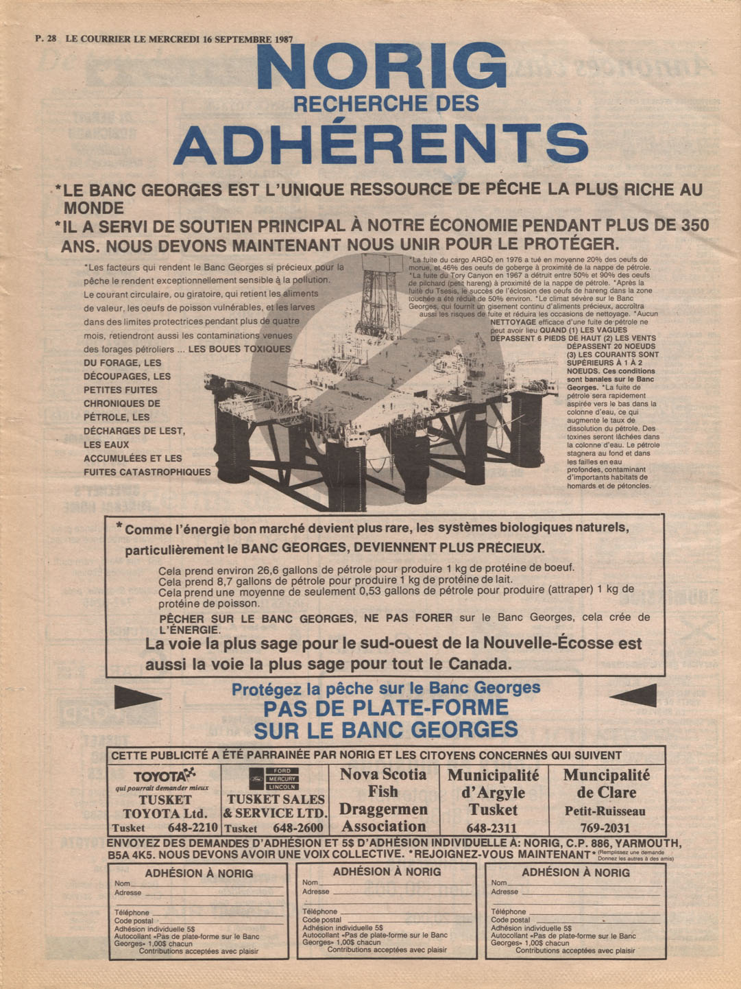 Le Courrier is Nova Scotia's leading French-language newspaper, and the only one with province-wide coverage and distribution. First published by Désiré d'Éon as Le Petit Courrier (Du Sud-Ouest de la Nouvelle-Écosse) on 10 February 1937, it has appeared weekly ever since, informing its readers, defending the interests of Acadians and francophones, and providing a bridge linking all Acadian regions in the province. It offers community news and events, extended articles, advertisements, announcements, photographs and special supplements, all directed towards supporting Nova Scotia's large, dispersed and diversified Acadian population, its businesses, industries, economy, daily activities, schools and higher education, politics, cultural life and heritage. Le Courrier offers an outstanding and unparalleled perspective on 66 years' accumulated history of Nova Scotia's Acadian population, thus enabling exploration of interests, activities, accomplishments, concerns and community issues across a broad swath of the 20th century.