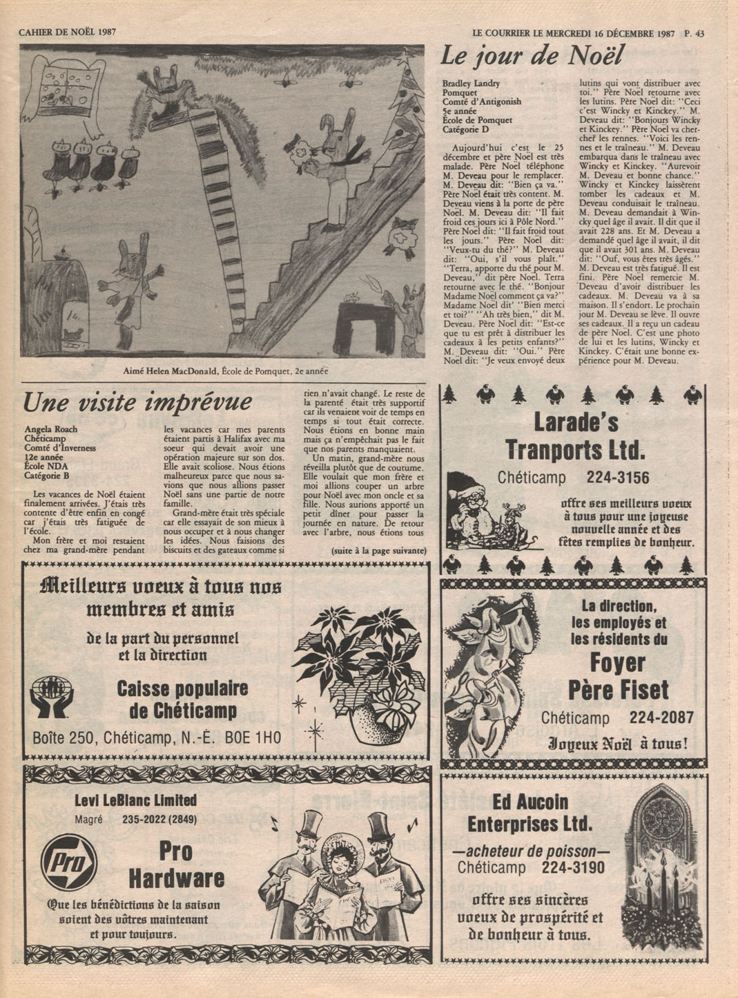 Le Courrier is Nova Scotia's leading French-language newspaper, and the only one with province-wide coverage and distribution. First published by Désiré d'Éon as Le Petit Courrier (Du Sud-Ouest de la Nouvelle-Écosse) on 10 February 1937, it has appeared weekly ever since, informing its readers, defending the interests of Acadians and francophones, and providing a bridge linking all Acadian regions in the province. It offers community news and events, extended articles, advertisements, announcements, photographs and special supplements, all directed towards supporting Nova Scotia's large, dispersed and diversified Acadian population, its businesses, industries, economy, daily activities, schools and higher education, politics, cultural life and heritage. Le Courrier offers an outstanding and unparalleled perspective on 66 years' accumulated history of Nova Scotia's Acadian population, thus enabling exploration of interests, activities, accomplishments, concerns and community issues across a broad swath of the 20th century.