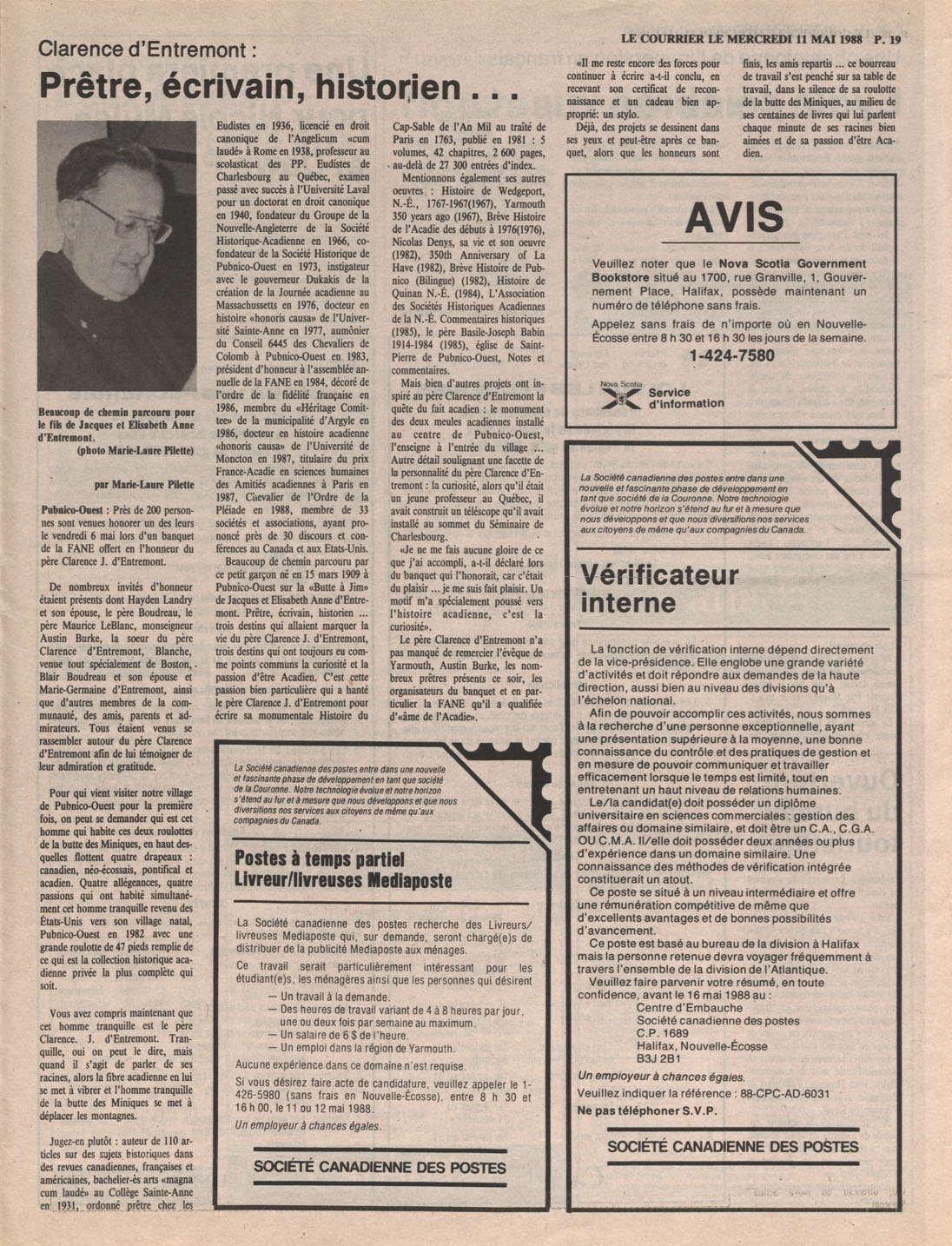 Le Courrier is Nova Scotia's leading French-language newspaper, and the only one with province-wide coverage and distribution. First published by Désiré d'Éon as Le Petit Courrier (Du Sud-Ouest de la Nouvelle-Écosse) on 10 February 1937, it has appeared weekly ever since, informing its readers, defending the interests of Acadians and francophones, and providing a bridge linking all Acadian regions in the province. It offers community news and events, extended articles, advertisements, announcements, photographs and special supplements, all directed towards supporting Nova Scotia's large, dispersed and diversified Acadian population, its businesses, industries, economy, daily activities, schools and higher education, politics, cultural life and heritage. Le Courrier offers an outstanding and unparalleled perspective on 66 years' accumulated history of Nova Scotia's Acadian population, thus enabling exploration of interests, activities, accomplishments, concerns and community issues across a broad swath of the 20th century.