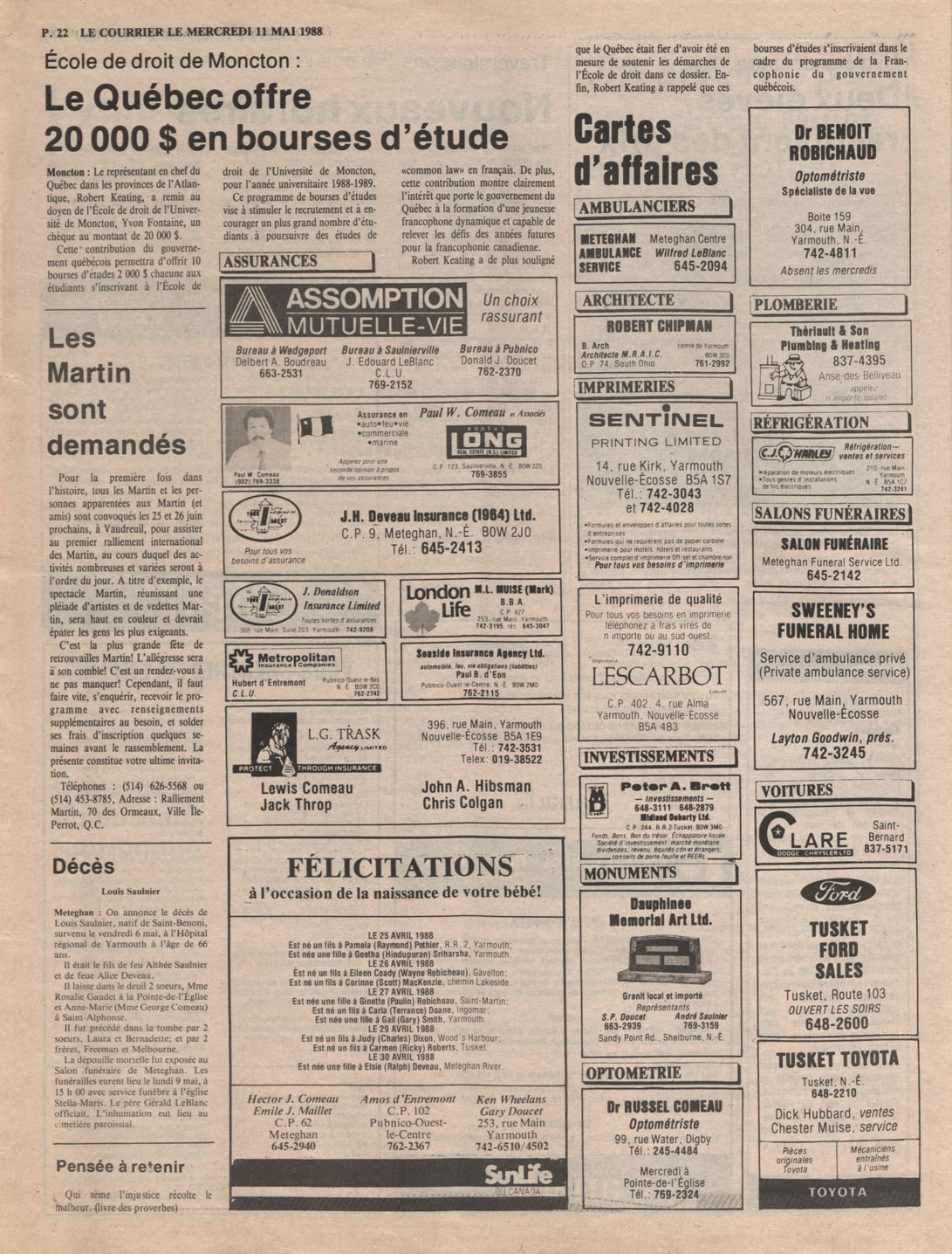 Le Courrier is Nova Scotia's leading French-language newspaper, and the only one with province-wide coverage and distribution. First published by Désiré d'Éon as Le Petit Courrier (Du Sud-Ouest de la Nouvelle-Écosse) on 10 February 1937, it has appeared weekly ever since, informing its readers, defending the interests of Acadians and francophones, and providing a bridge linking all Acadian regions in the province. It offers community news and events, extended articles, advertisements, announcements, photographs and special supplements, all directed towards supporting Nova Scotia's large, dispersed and diversified Acadian population, its businesses, industries, economy, daily activities, schools and higher education, politics, cultural life and heritage. Le Courrier offers an outstanding and unparalleled perspective on 66 years' accumulated history of Nova Scotia's Acadian population, thus enabling exploration of interests, activities, accomplishments, concerns and community issues across a broad swath of the 20th century.