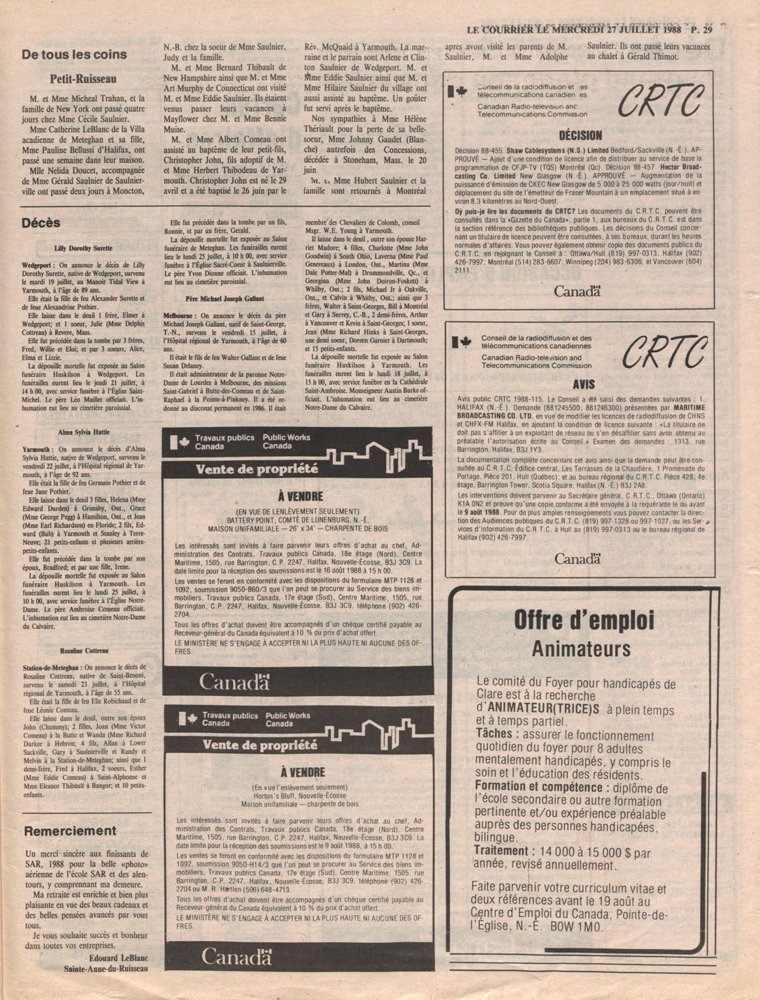 Le Courrier is Nova Scotia's leading French-language newspaper, and the only one with province-wide coverage and distribution. First published by Désiré d'Éon as Le Petit Courrier (Du Sud-Ouest de la Nouvelle-Écosse) on 10 February 1937, it has appeared weekly ever since, informing its readers, defending the interests of Acadians and francophones, and providing a bridge linking all Acadian regions in the province. It offers community news and events, extended articles, advertisements, announcements, photographs and special supplements, all directed towards supporting Nova Scotia's large, dispersed and diversified Acadian population, its businesses, industries, economy, daily activities, schools and higher education, politics, cultural life and heritage. Le Courrier offers an outstanding and unparalleled perspective on 66 years' accumulated history of Nova Scotia's Acadian population, thus enabling exploration of interests, activities, accomplishments, concerns and community issues across a broad swath of the 20th century.